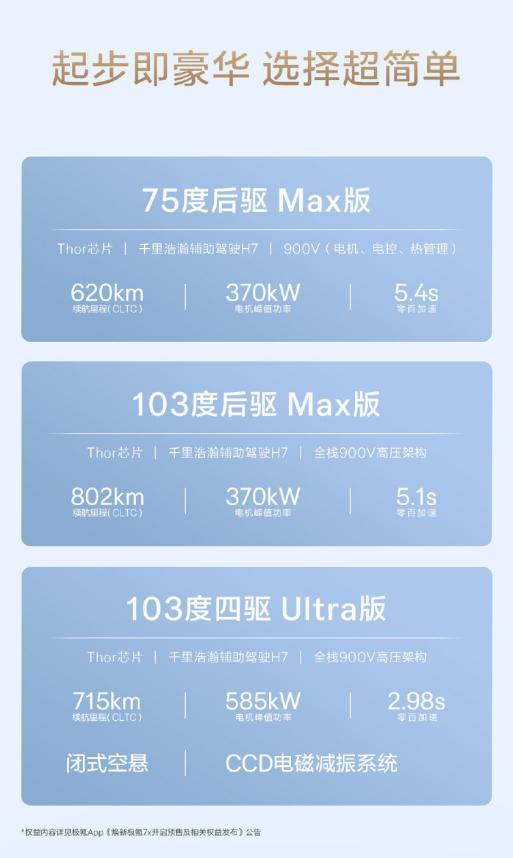 极氪7X焕新版今天开启预售,2000元订金抵7000元购车款,聊聊车辆升级的点,这次的焕新策略和极氪001差不多,外观小调整,底盘动力智能化都升级了,新增小蓝灯,包围更运动了,内饰隔音升级,麂皮的顶棚+双层加胶玻璃。全系升级900V平台,103度电的四驱Ultra版10分钟充电10%到80%,续航也破800km了,辅助驾驶升级千里浩瀚H7,700TOPS的Thor-U芯片,帮大家把长图分段了,方便阅读。新车10月28日正式上市,现在展车已经到店了,大家可以先去试试车,体验体验哈。【来自懂车帝车友圈】