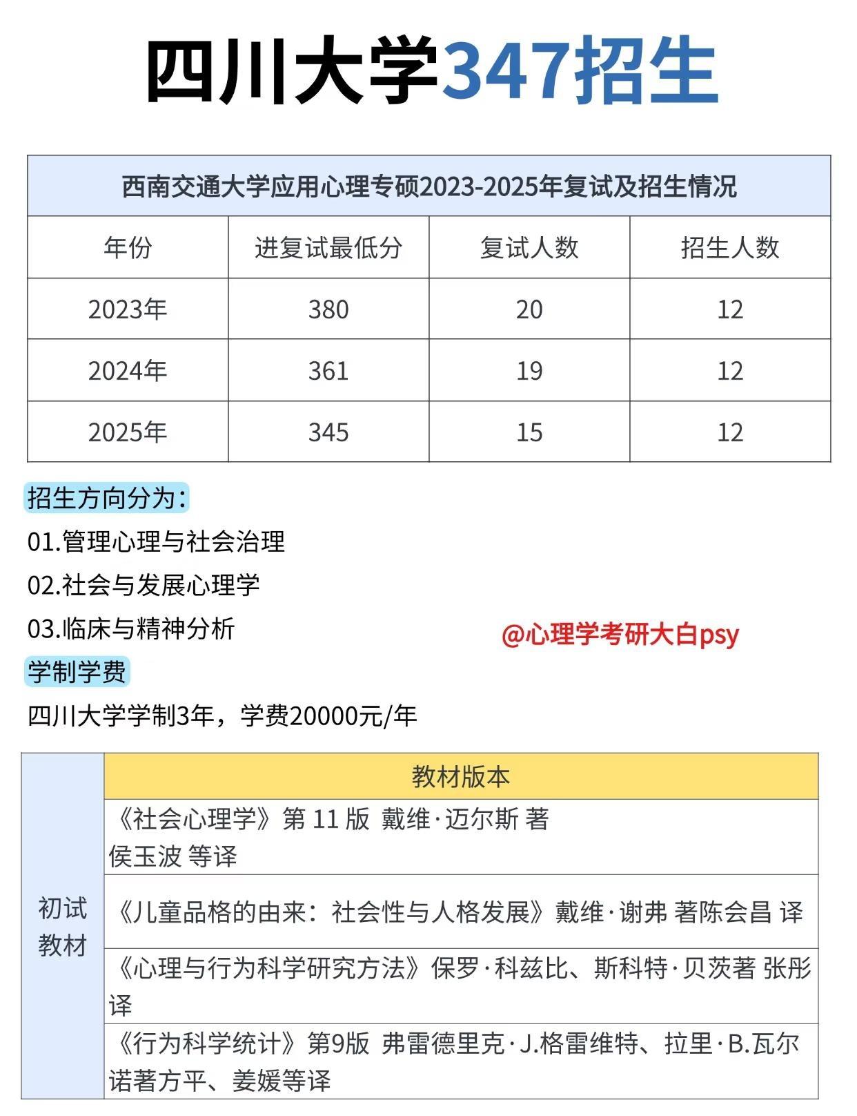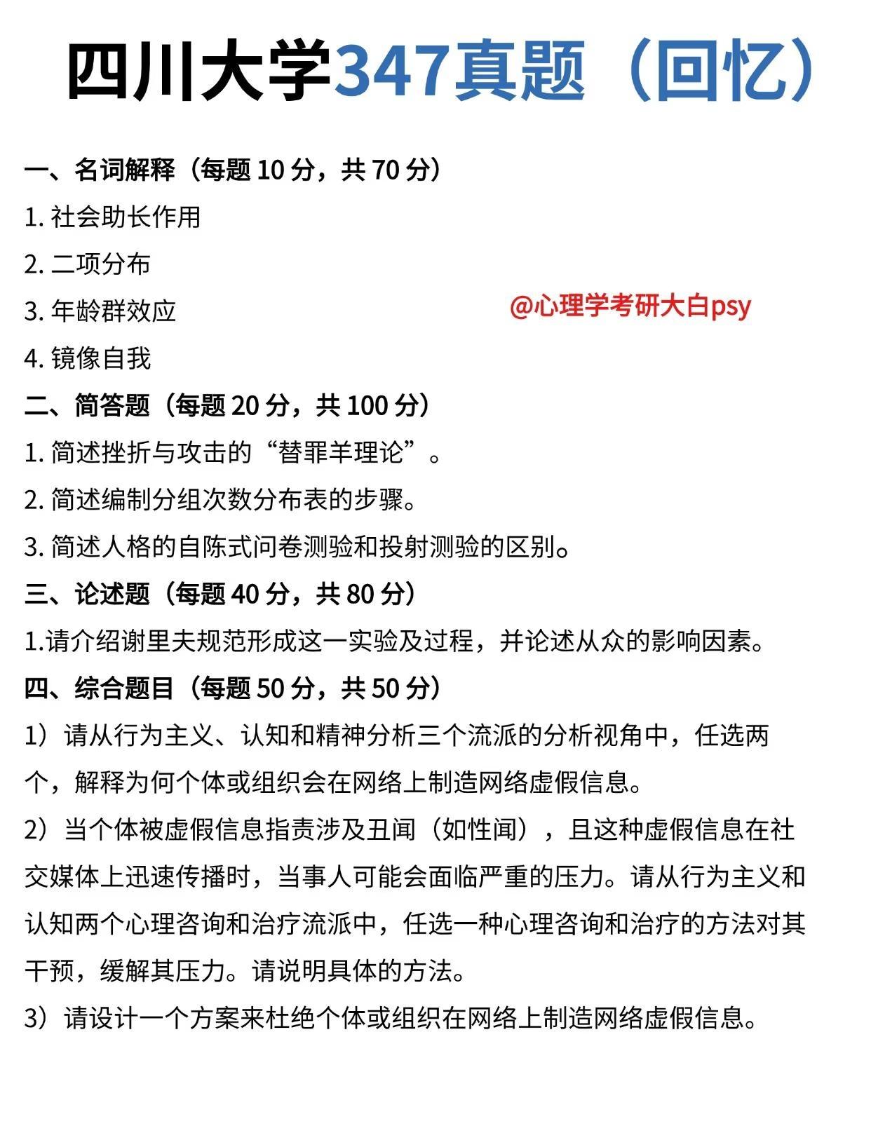 🙌大白讲院校系列|四川大学347 大白讲院校系列今天讲的是—四川大学 · ✅招生稳定,每年10-12个 ✅院校层次高,川渝985 ✅保护一志愿,不歧视跨考 ✅精神分析是特色方向 · 🔺26考情注意 👉书单更换,今年川大专删除原有的《心理学与生活》,新增《心理与行为科学研究方法》,并将《现代心理与教育统计学》调整为《行为科学统计:原书第9版》 👉报考人数减少,川大的报考人数从20年的报考巅峰1051人报考,到25年261人报考,今年书单更换且都是小众书目,报考人数预计持续减少 · 🔺真题分析 往年川大的真题以主观题为主,其中名词解释和简答题是直接提取参考书的知识点进行提问,论述和综合题目会更加灵活和复杂 [一]重视考生对心理学经典实验的了解,要求复现实验的基本过程,如“请介绍谢里夫规范形成这一实验及过程”; [二]统计分析能力的考查再次以文字材料、数据图表为题干,进而提出纠正材料中的错误、判断所使用的统计方法等问题; [