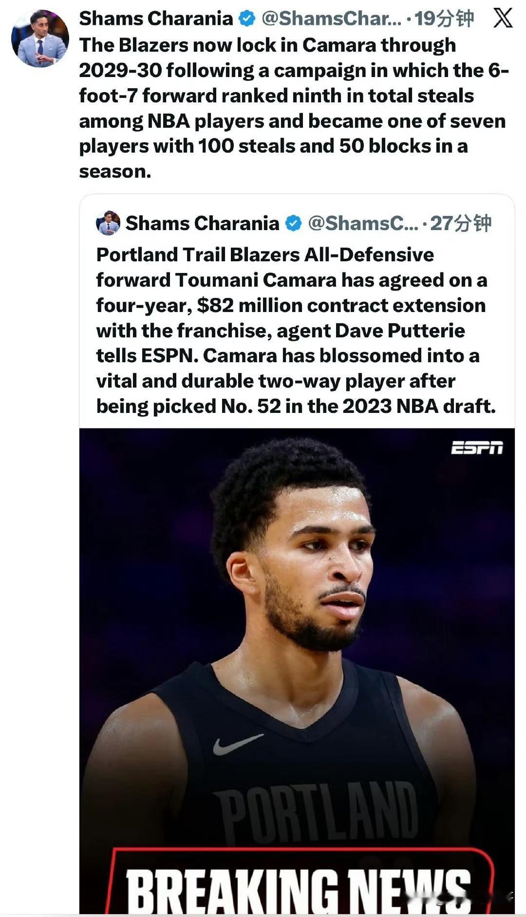 开拓者又淘到宝了!!!开拓者4年8200万续约52号新秀! 根据记者Shams