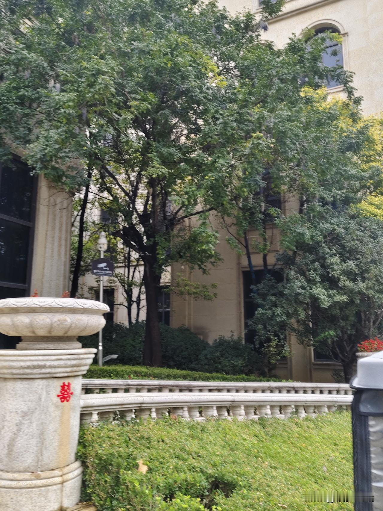 藏在细节里的温度 社区的角落,总藏着不期而遇的温柔。 那尊米白色石制花钵静静立着,柱身一侧,“囍”字如朱砂凝成的小火焰,热烈又鲜活——许是哪家新人刚在此处留下过喜悦的印记,让冰冷的石材也沾了人间的甜意。花钵上方的弧形轮廓,似将一捧清风拢在其中,此刻却空着,倒像在等一场花开,等四季的芬芳在此间流转。 花钵旁的矮栏同样是米白石材,栏柱精巧如白玉雕琢的琴键,无声弹奏着社区的日常韵律。栏外的草坪鲜翠欲滴,几丛灌木将绿意揉得更浓,而那棵高大的树,枝叶繁茂如巨伞,把天空滤成了碎玉般的光斑,落在米色建筑的墙面上。 建筑的拱门与窗框藏着欧式风情,却因这“囍”字、这草木,添了烟火气。旁边的监控牌默默守护,垃圾桶也安静伫立,它们与生机盎然的草木、带着温度的“囍”字,共同织就了社区的肌理——在这里,坚硬的建筑与柔软的生活共情,每一处细节都在诉说:日子或许平淡,却总有温暖的印记,在不经意的角落,悄悄点亮时光。