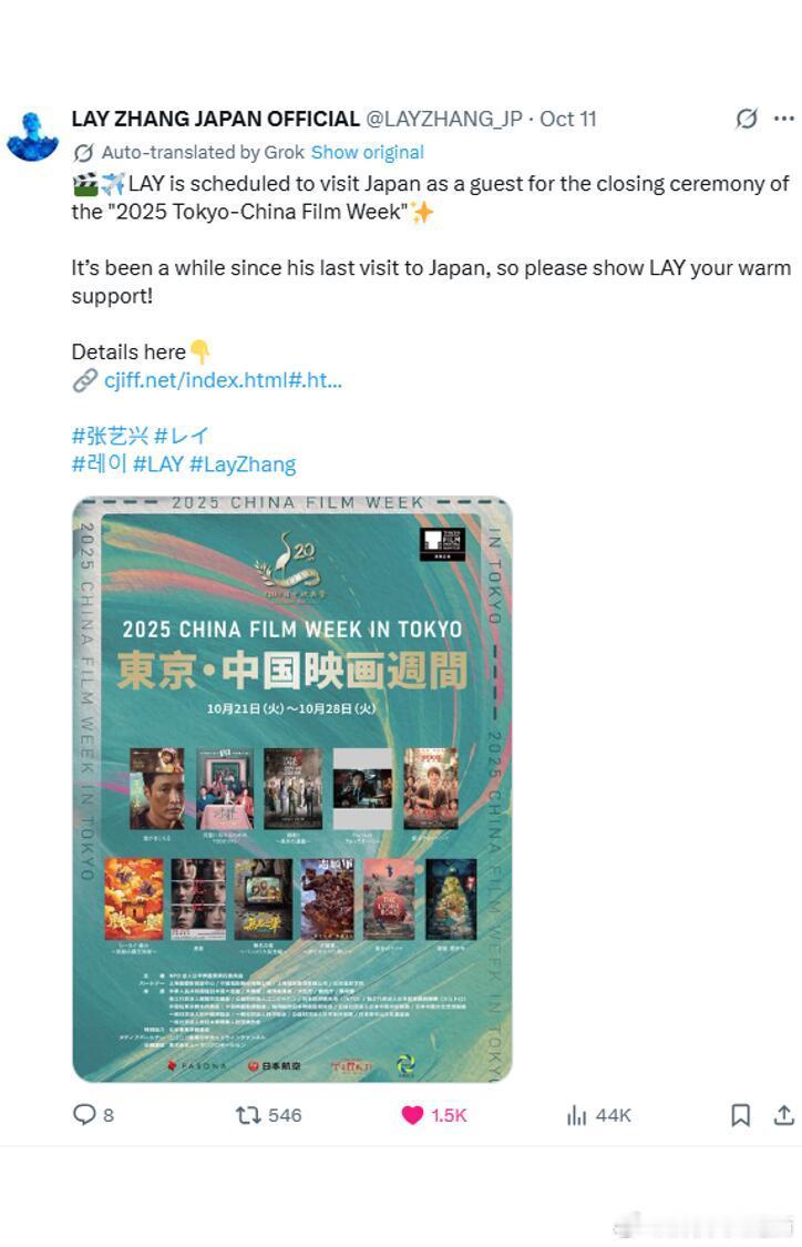 张艺兴将携《不说话的爱》亮相东京电影节张艺兴将携电影作品《不说话的爱》于10月27日亮相东京国际电影节开幕红毯,10月28日出席中国电影周闭幕式及金鹤奖颁奖典礼。同时《不说话的爱》将于2026年1月9日在日本正式上映。