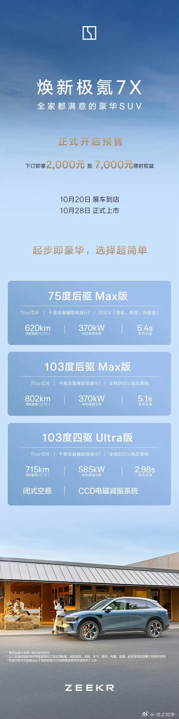焕新极氪7X这次真的“听劝”——全系升级900V高压架构,充电10分钟续航10%-80%,续航最长802km,性能党狂喜!双电机版零百加速直接干到2.98秒
