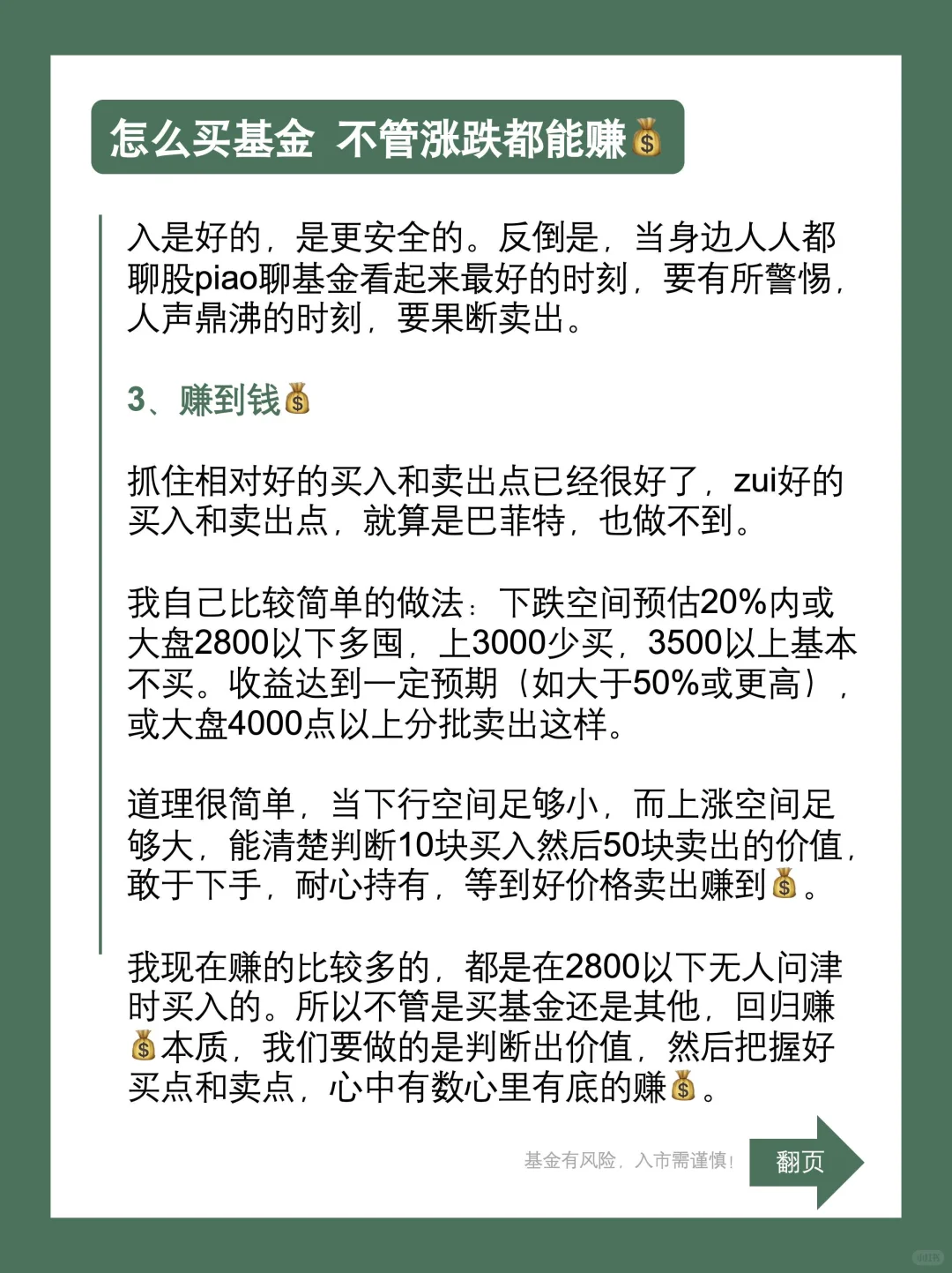 想抓住最好的买入和卖出点,巴菲特也做不到。我自己比较简单的做法:下跌空间预估20%内或大盘2800以下多囤,上3000少买,3500以上基本不买。收益到一定预期或大盘4000以上分批卖出这样。当下行空间足够小,而上涨空间足够大,做到清楚判断10块买入然后50块卖出的价值才赚💰。不管是买基金还是其他,回归本质,我们要做的是判断价值,把握好买点和卖点,心中有数心里有底的赚💰。