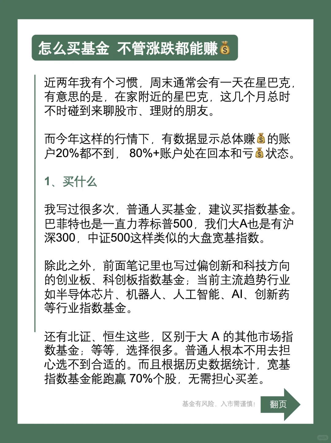 我写过很多次,普通人买基金,建议买指数基金。巴菲特也是一直力荐标普500,我们大A也有沪深300,中证500这样类似的大盘宽基指数。除此之外,有偏创新和科技方向的创业板、科创板指数基金;主流趋势如半导体芯片、机器人、人工智能、AI、创新药等行业指数基金;还有北证、恒生这些区别于大A的其他市场指数基金,选择很多。