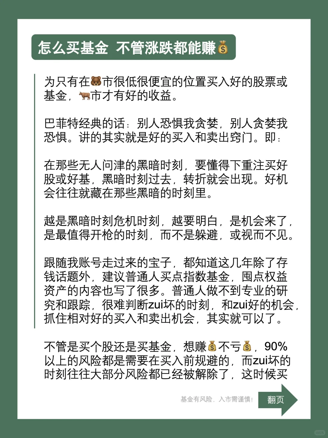 zui好的机会往往都是出现在zui坏的时刻。理财收益的高低不是由🐂市决定,而是由🐻市决定,因为只有在🐻市很低很便宜的位置买入好的股票或基金,🐂市才有好的收益。巴菲特非常经典的话:别人恐惧我贪婪,别人贪婪我恐惧。讲的其实就是好的买入和卖出窍门。在那些无人问津的黑暗时刻,要下重注买好股票或好基金,因为黑暗时刻过去,转折就会出现。越是黑暗时刻危机时刻,越要明白机会来了,是最值得开枪的时刻,而不是躲避或视而不见。