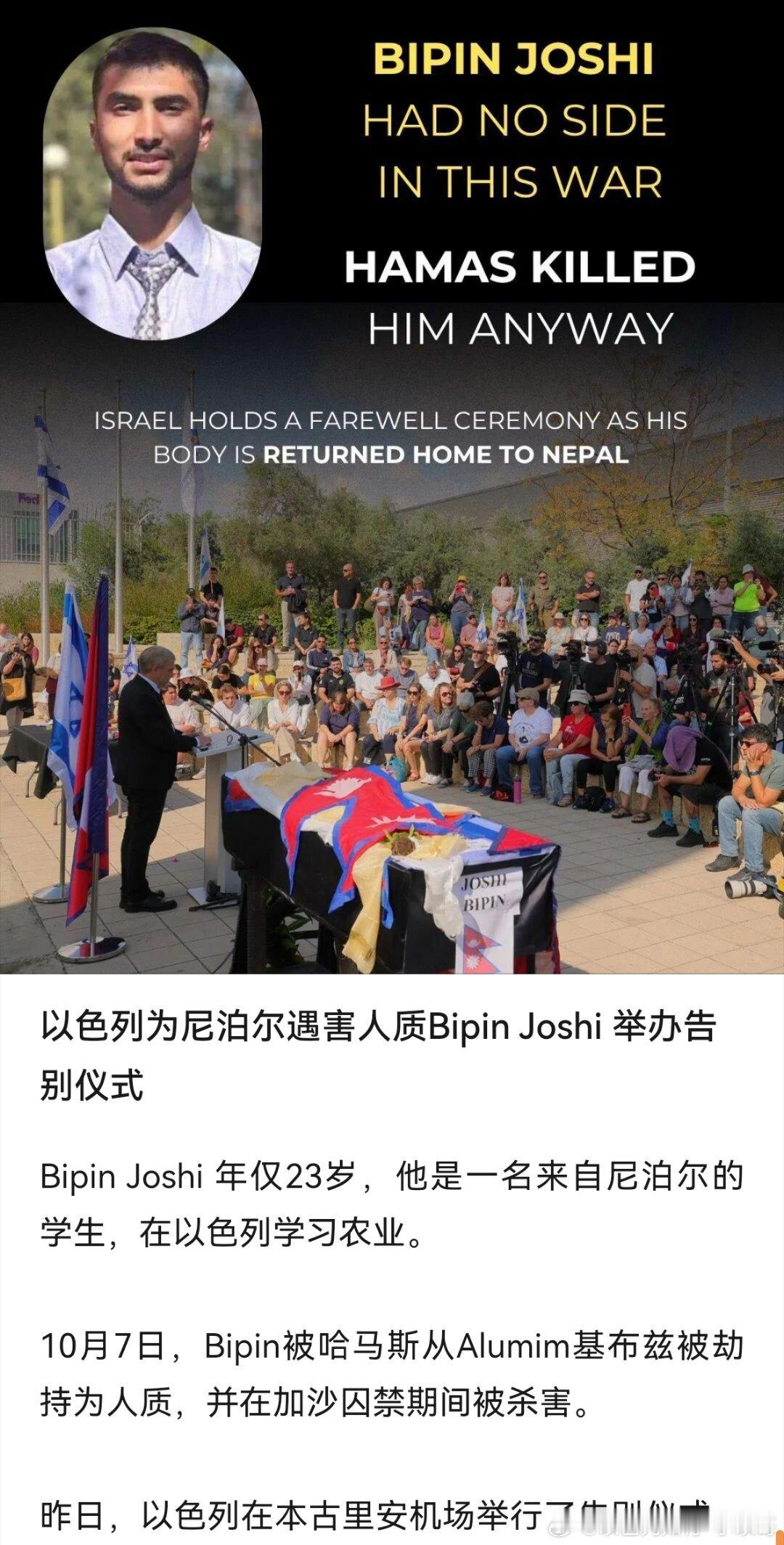 以色列为哈马斯绑架的尼泊尔人质Bipin举行哀悼仪式。一个充满希望的无辜生命,却过早的被哈马斯恐怖分子剥夺了生命。愿Bipin安息💔