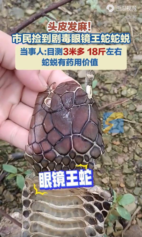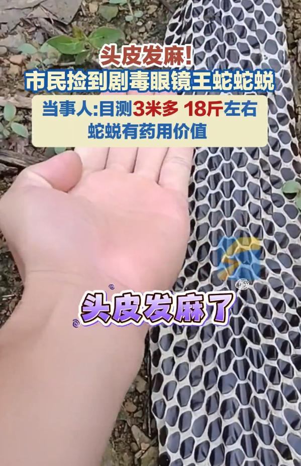10月15日,广西来宾,一男子捡到一条3米多的巨型眼镜王蛇蛇蜕,比小臂还粗,他目测约有18斤,这条蛇蜕比较完整,估计能卖不少钱,网友:这也太吓人了! 闪电新闻10月15号报道,广西来宾的山林里,一名四十岁的男子像往常一样在山路上溜达,没成想一场意外的遭遇让他记了好久。 远远地,他看见前面林子的地上横着个黑白相间的长条物,蜷在那里一动不动,粗粗的模样看着就有点吓人。 他心里咯噔一下,脚步立马停住了,凑近了些才看清那东西的轮廓,足足有成人小臂那么粗,看着就像一条盘着的大蛇。 当时他吓得差点转身就跑,毕竟这山里偶尔会遇到野物,这么大的“蛇”可不敢轻易招惹。 可他又觉得不对劲,那东西半天没一点动静,连蛇类的“嘶嘶”声都没有。 壮着胆子再往前走了几步,他才发现这根本不是活蛇,而是一张完整的蛇蜕。 悬着的心一下子放了下来,随之而来的是止不住的喜悦。 他赶紧掏出手机拍了照,又小心翼翼地把蛇蜕拎起来摊开,量了量长度,居然有三米多。 蛇蜕上的鳞片花纹还很清晰,黑白格子的图案在阳光下看得明明白白,凭着山里生活的经验,他一眼就认出这是眼镜王蛇的蛇蜕。 这蛇蜕确实少见,不仅个头大,还特别完整,连头部的轮廓都清晰可见,摸上去带着点干燥的质感,却没有一点破损。 要知道蛇蜕本来就脆弱,风一吹就容易碎,能保留成这样,实在是不容易。 根据这蛇蜕的大小估算,蜕下这层皮的眼镜王蛇,重量大概得有十八斤。 在他眼里,这可不是普通的蛇皮,是实打实的宝贝。 常有人专门上山收购这种完整的蛇蜕,在中医里它有个名字叫“龙衣”,能祛风止痒、明目,药店卖的那些都是经过干净晒干处理的。 而且这么完整的巨型蛇蜕,还有人拿来做标本或者装饰,说是有“脱胎换骨”“去旧迎新”的寓意,收藏价值也不低。 看着这张蛇蜕,他不由得想起眼镜王蛇的样子。 那可是世界上最长的毒蛇之一,生性凶猛,排毒量又大,在野外真要是遇上活的,危险程度可想而知。 他心里隐隐有些担忧,毕竟蛇蜕看着还很新,说不定蜕皮的时间不长,那蛇会不会就在附近? 没敢多耽搁,他赶紧把蛇蜕整理好带着山下走,心里盘算着这东西应该能卖个好价钱。 后来这事被发到网上,不少网友都觉得新奇。 有人说光看照片都觉得震撼,很难想象现场看到这么大的蛇蜕是什么感受,也有人替他捏了把汗,觉得这么新的蛇蜕,附近很可能还有蛇活动,实在太冒险了。 也有网友说,眼镜王蛇其实很警惕,一般感觉到有人靠近就会主动溜走,而且蛇蜕皮是个很消耗体力的过程,蜕完皮后身体虚弱,会找个安全的地方躲起来恢复,不会在蜕皮的地方逗留太久。 这样的说法,让不少担心的人松了口气。 这场山林里的遭遇,既有惊吓也有惊喜。 大自然就是这样奇妙,一条蛇的生长过程,竟能留下如此特别的“馈赠”。 但同时也得记着,亲近自然的时候,安全永远是第一位的,就像这位男子,发现宝贝后没有贪恋停留,及时下山的做法,确实很稳妥。