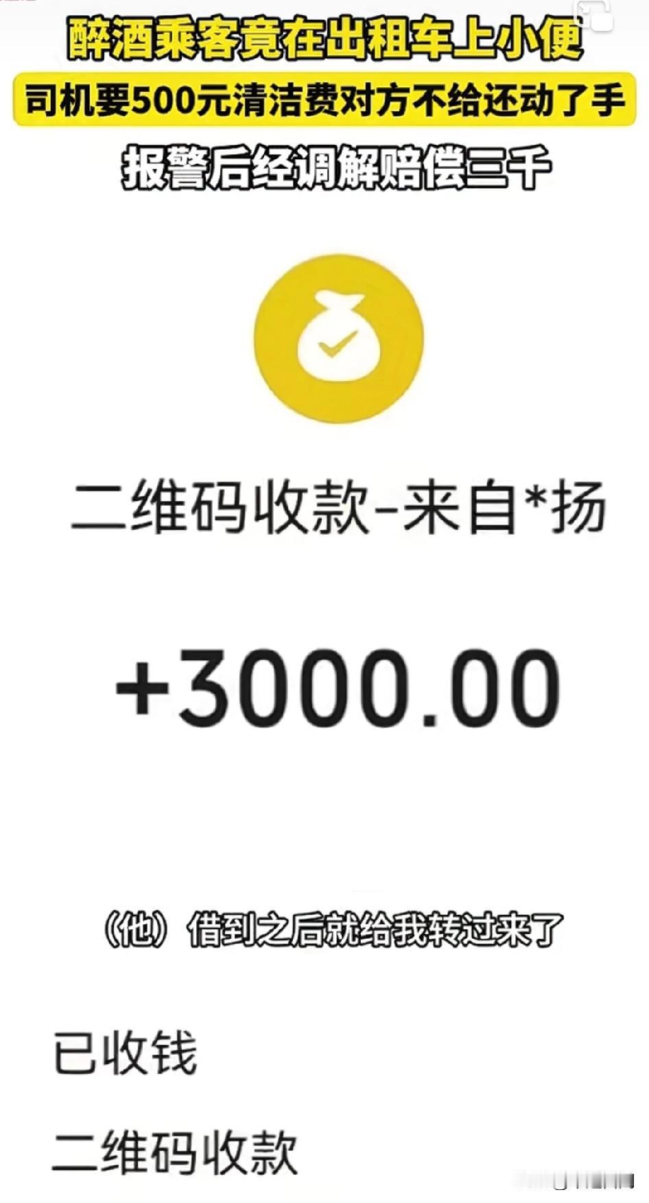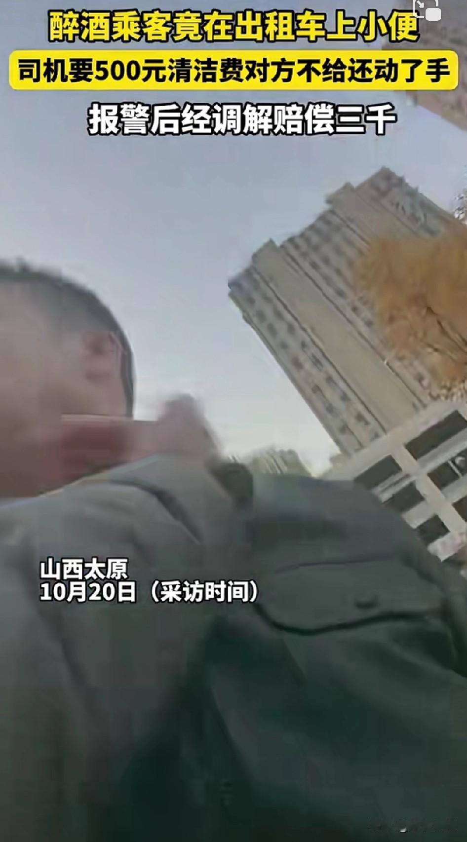 一泡尿价值三千块!司机快压不住嘴角![捂脸] 兄弟这酒白喝了,后续完整版! 近日山西太原,醉酒乘客在出租车上小便,司机要500元清洁费对方不给还动了手,报警后经调解赔偿3000。 司机:“头一回遇到这种情况,给我尿到车上了啊!当时我问他要500块,他说不行,我说那就等警察处理吧!完了他就动手打我。” 可惜司机全程录像,被打时,好像笑了,警察来后乘客才焉了吧唧的同意私下和解,司机说3000,乘客没敢还价,借钱凑够三千立马转账。