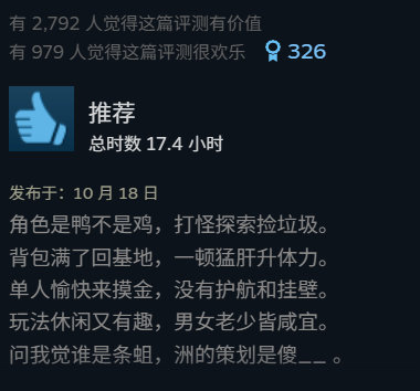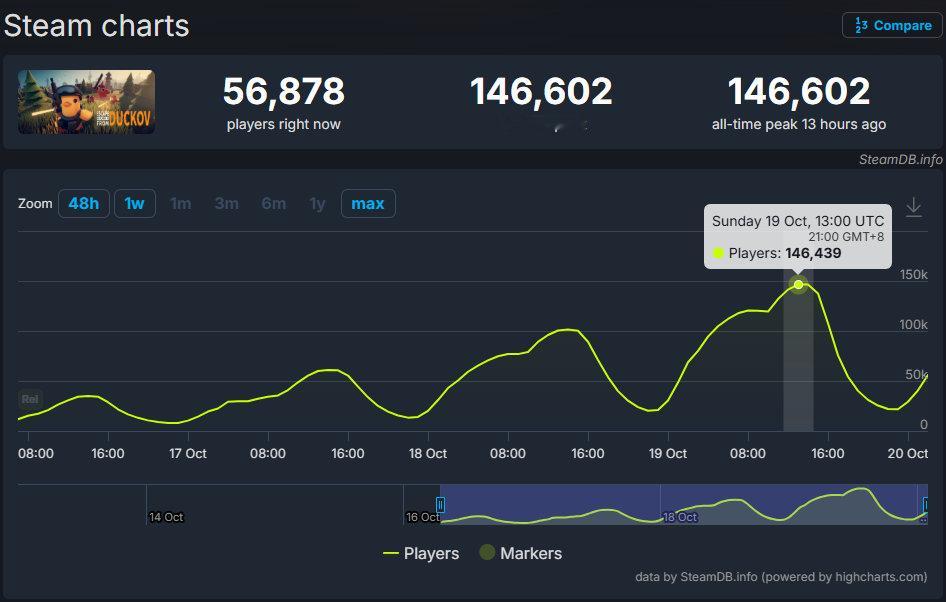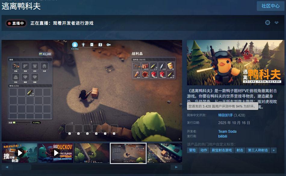 鸭鸭搜打撤游戏《逃离鸭科夫》销量已突破50万份。本作目前在Steam上的简中好评率为94%,全语言好评率为95%,最高同时在线人数为146602人。