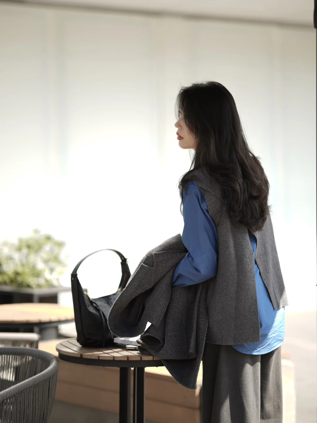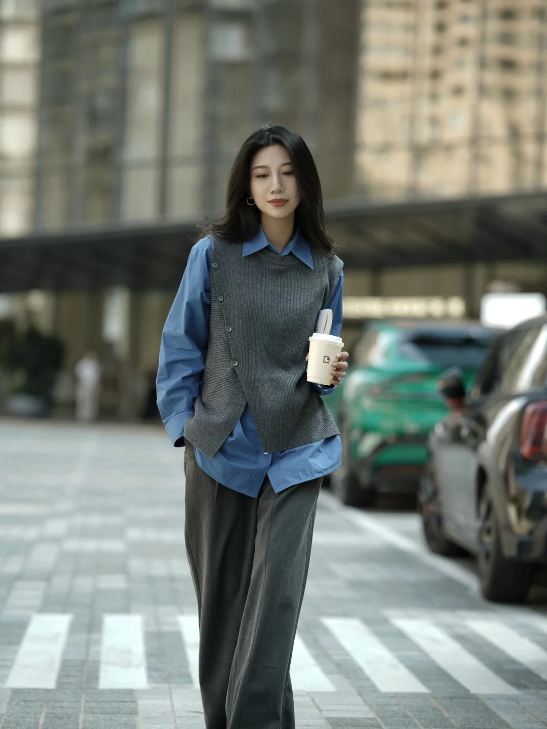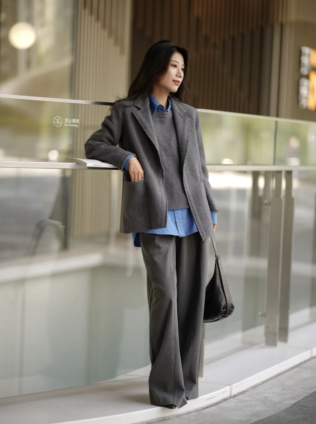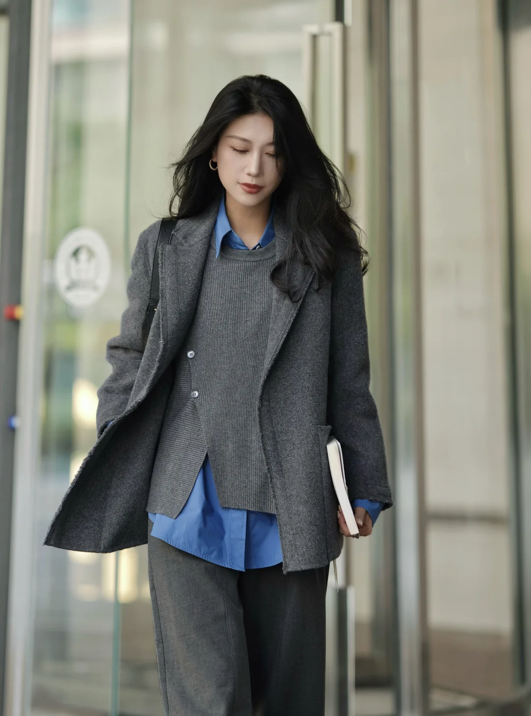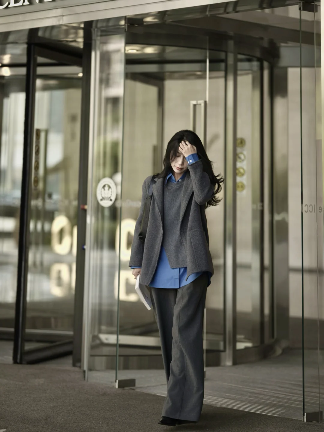 一件中灰针织马甲的柔软,叠加灰色西装的利落,