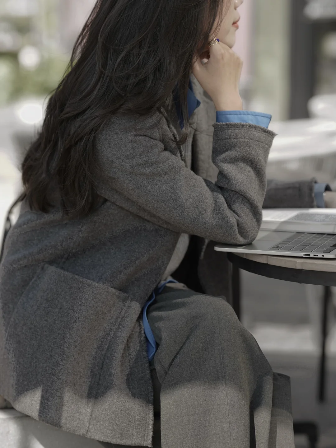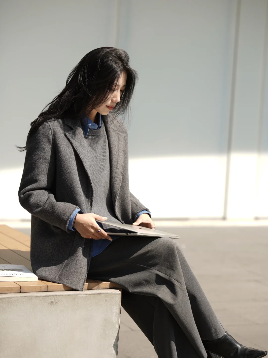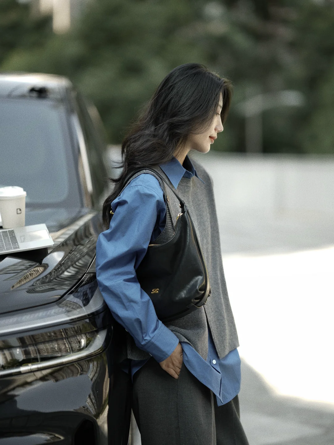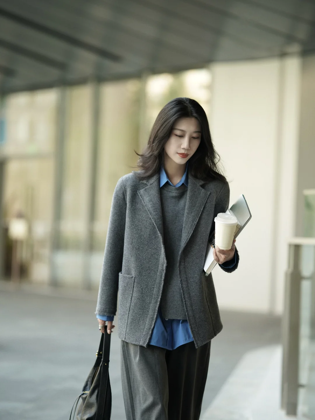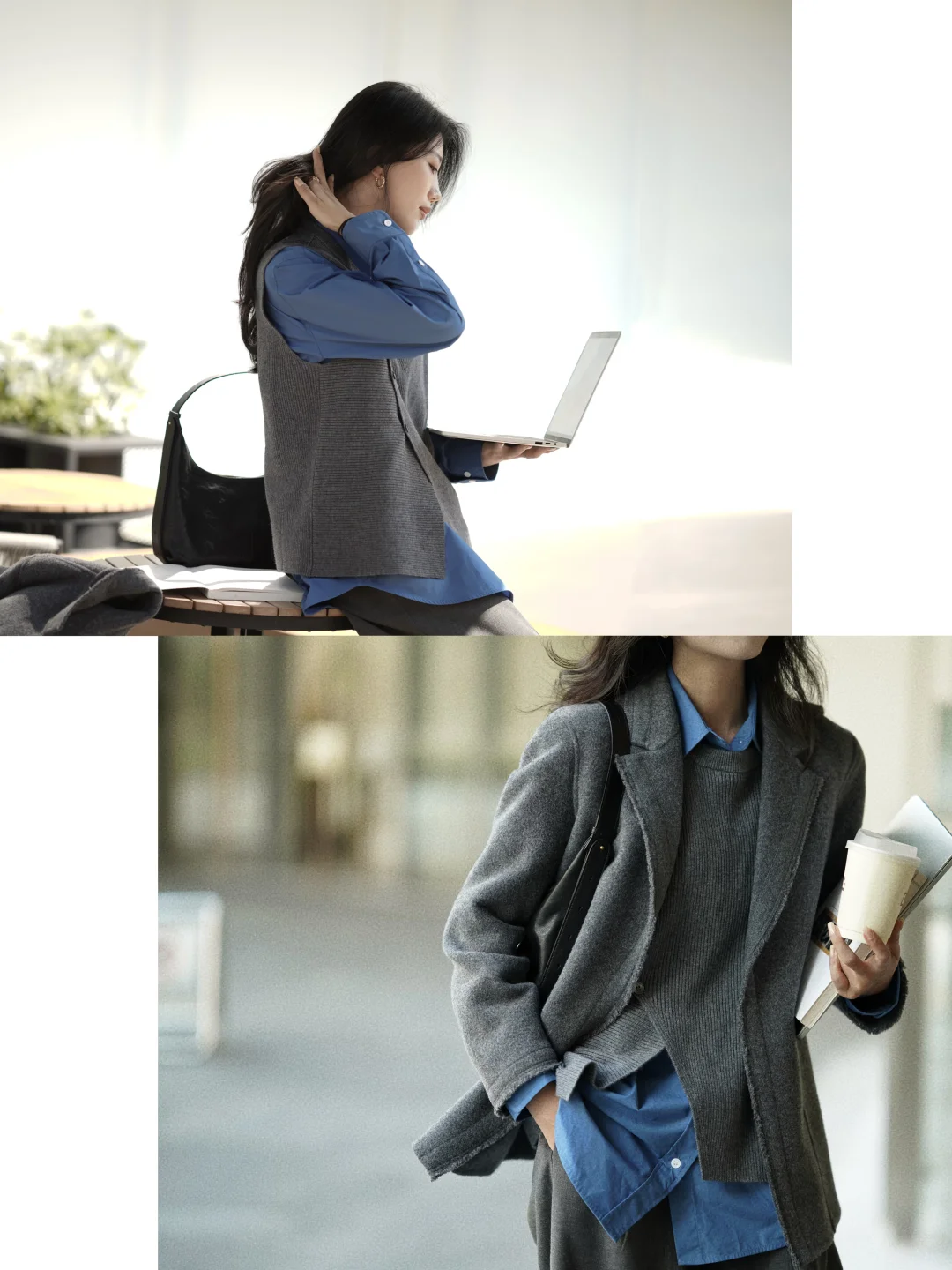 一件中灰针织马甲的柔软,叠加灰色西装的利落,