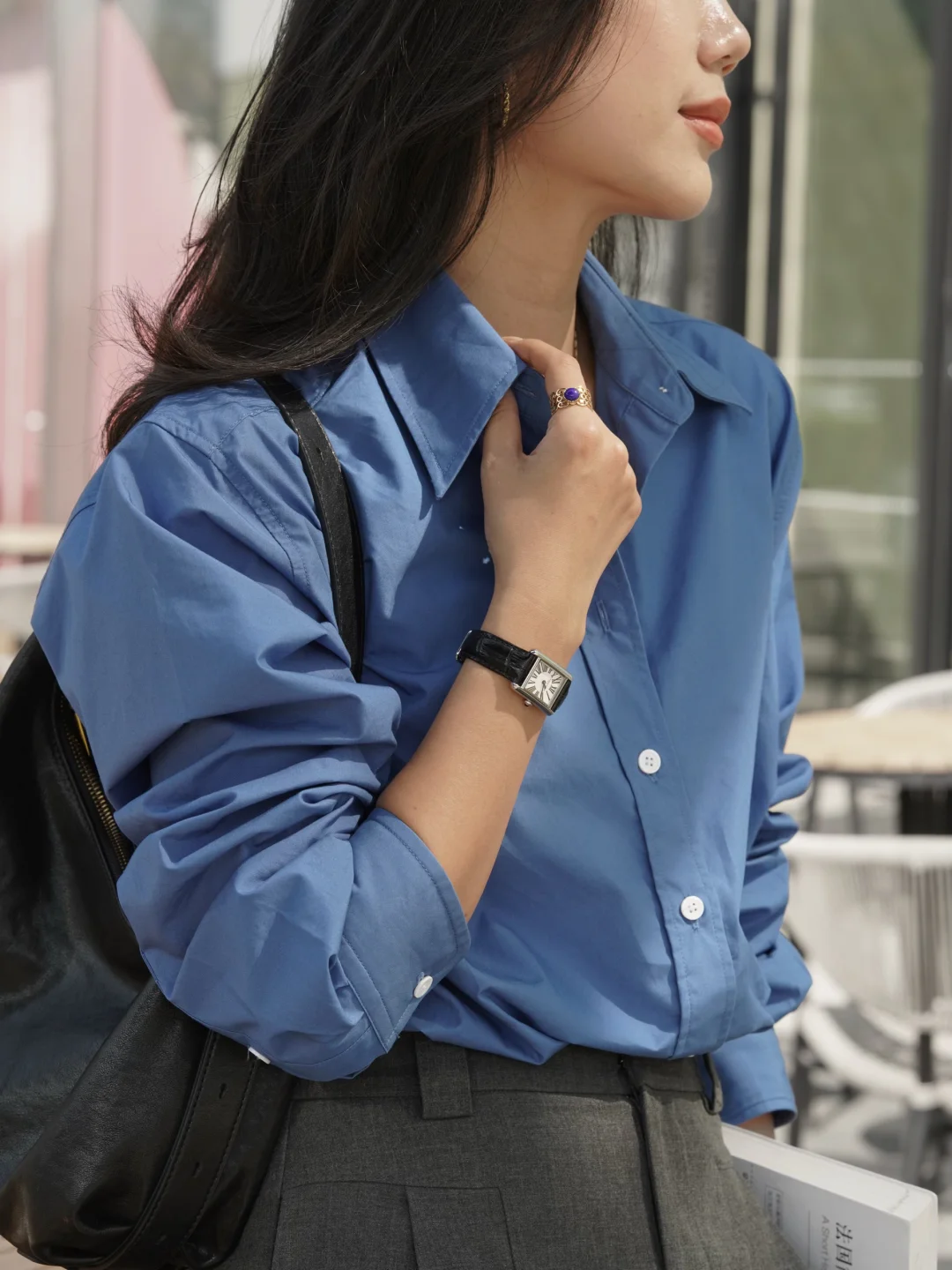 此时,一件挺括的蓝色衬衫,是点睛之笔。