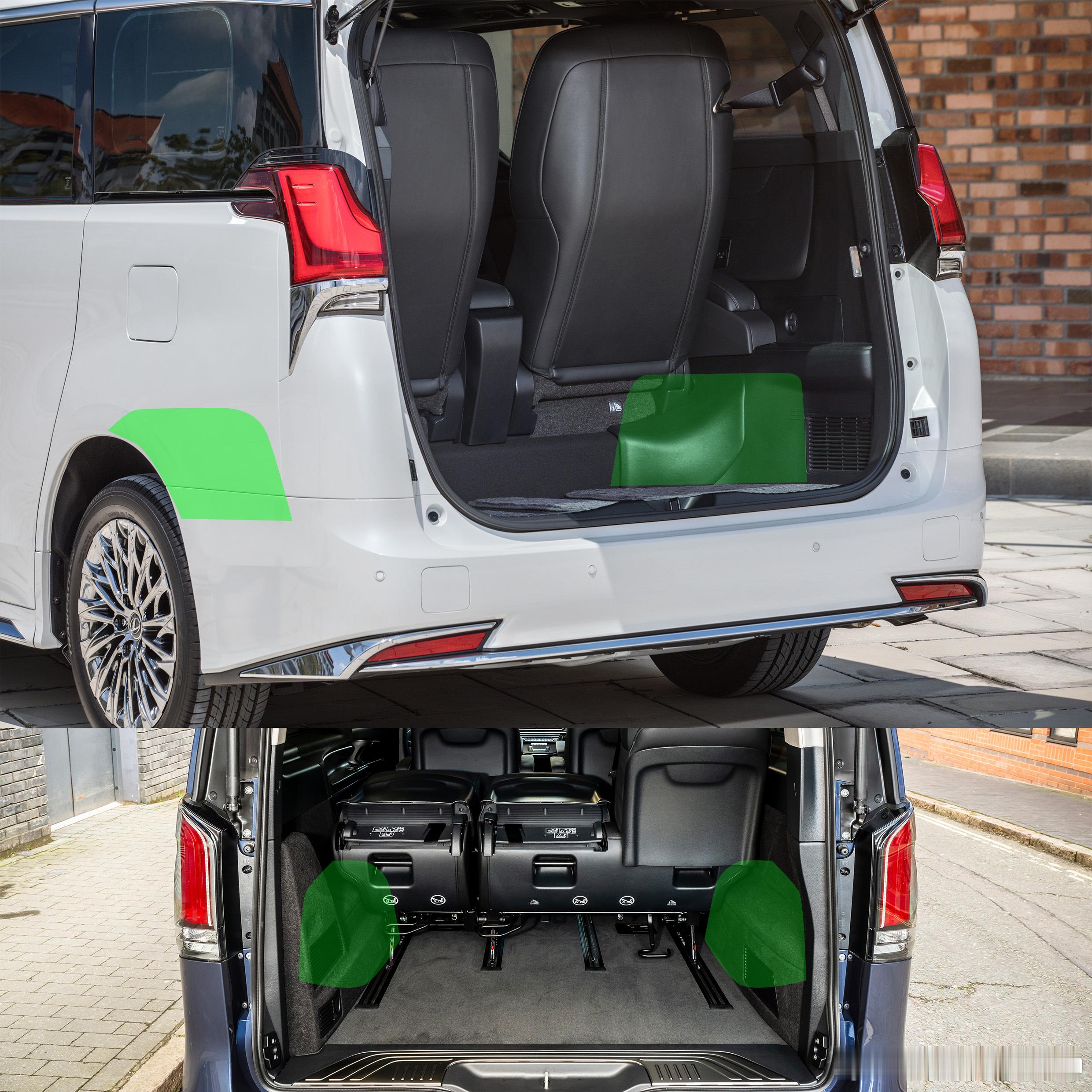 目前的MPV解法是,依然提供一个适中的车轮尺寸,把车身墙体做厚,把车轮包裹在墙体内,同时在墙体上提供一些杯架和手机卡槽来“掩饰”这个问题。并抬高第三排座椅高度,尽量减少轮包对座椅宽度带来的影响。
