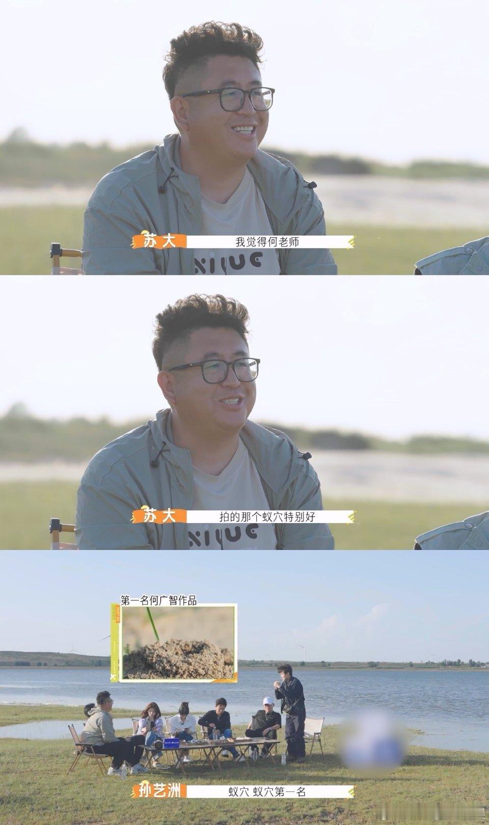 起猛了何广智和齐白石一个咖位了 何广智拍蚁穴拿第一后自信心爆棚!把自己和孟非、齐白石并列,还一本正经分析“各有特色”,孟非的无奈吐槽让场面更搞笑了! ​​​