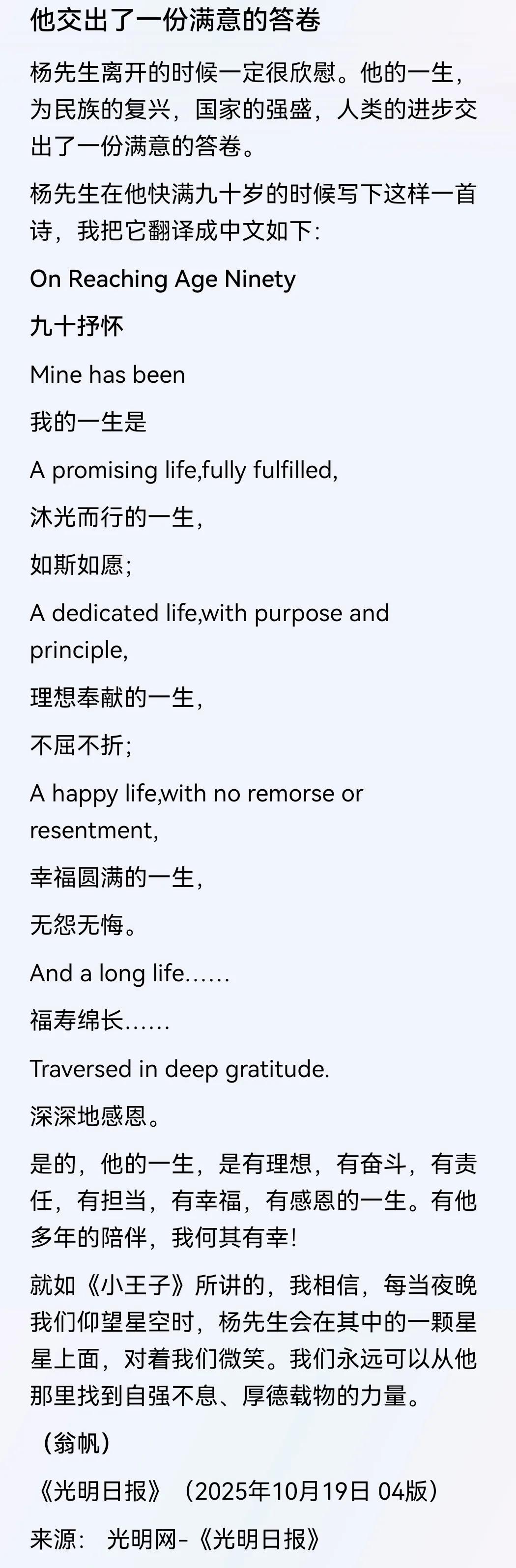 先生去世第二天,很多人都以为翁帆会一如既往的内敛沉默,继续以青衣素人默守静养着和先生的那份世纪之恋,殊不想,翁帆却在《光明日报》以另一种方式来悼念对先生的爱!我想说,是的,先生是交出了一份满意的答卷,但是没有你翁帆21年不忘初心默默的坚守和付出,先生的答卷尽管是完美的,但也许人生是有遗憾的。 评论; 一切盖棺定论!以前的非议退去可以正名,真正伟大的女性! 所以大家以后不要去喷张导演了,先声明哈,我跟他非亲非故,一点不熟!!!! 杨振宁后前半生美国学习,提升为最顶级物理学家,后半生把所学知识全部教给中国学生,用于中国物理的进步。 我以为我最多几年就解脱了,谁知道整整28年,家人们谁懂啊,这28年我怎么过来的,这是一场失败的投资案列! 男人娶年纪小的老婆,除非老婆是贤妻,不然真得就是催命符,杨振宁的长寿,足以说明,曾凡把他照顾的相当好 杨老有爱的支撑才有动力精力体力为科研做贡献,感谢他俩。网上骂她的人不懂爱情的力量,也不懂爱。