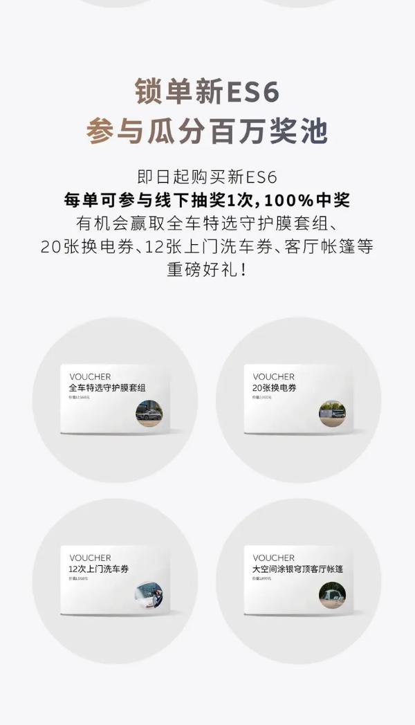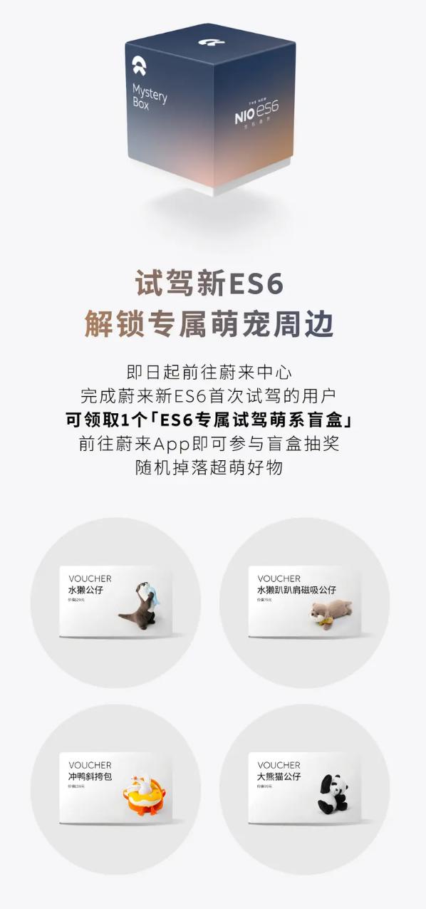 时间飞快,蔚来ES6即将交付30万台,官方推出三重礼,咱看看有啥可薅的。10月20日到10月31日期间,首次试驾新车的用户,能领取一个专属盲盒,几款公仔还是挺可爱的;买新ES6的用户可以参加抽奖,100%中奖,有机会赢车模、换电劵、上门洗车劵等礼物;邀请好友首次试驾,同样能获得一个试驾盲盒,有一些商城和养车的减免券。大家还记得初代蔚来ES6的上市时间吗?评论区找一个答案!【来自懂车帝车友圈】