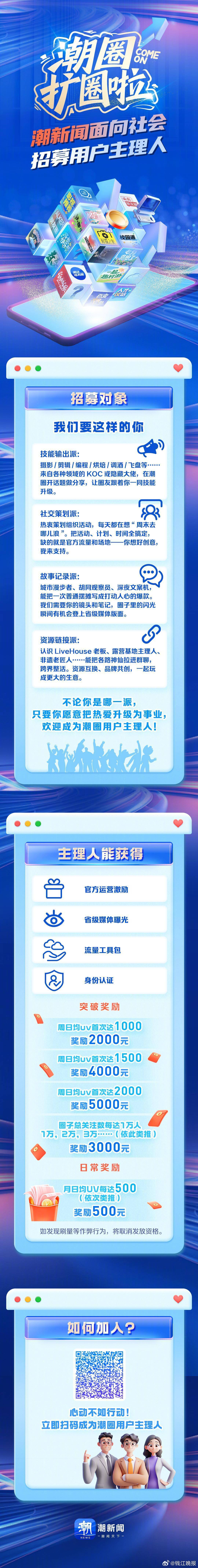 这是一个巨大的线下“热爱同频场”,千万种美好的生活方式即将在此发生碰撞与连接。在这里,你可以马上报名成为潮圈主理人,我们将为你量身定制“兴趣”市集,让你与搭子们围炉煮茶、线下相聚;在这里,你也可以与潮圈搭子线下接头,一起来参与潮圈趣玩穿越赛,打卡不同兴趣圈子的趣味玩法,把美好潮礼带回家。 (潮新闻 记者 潘心怡 顾喆翡 设计 安瑛 梁淑敏)