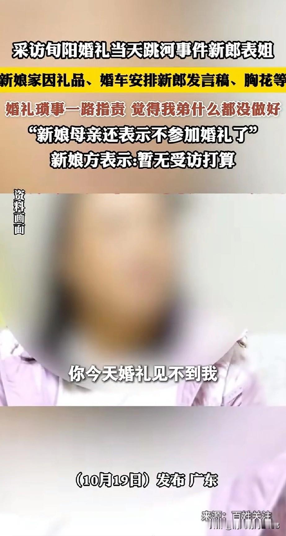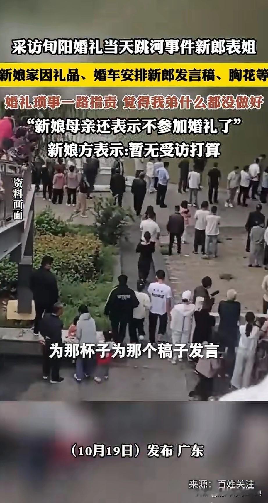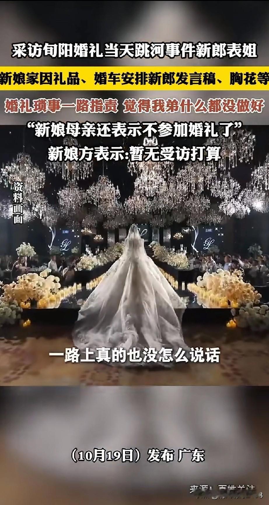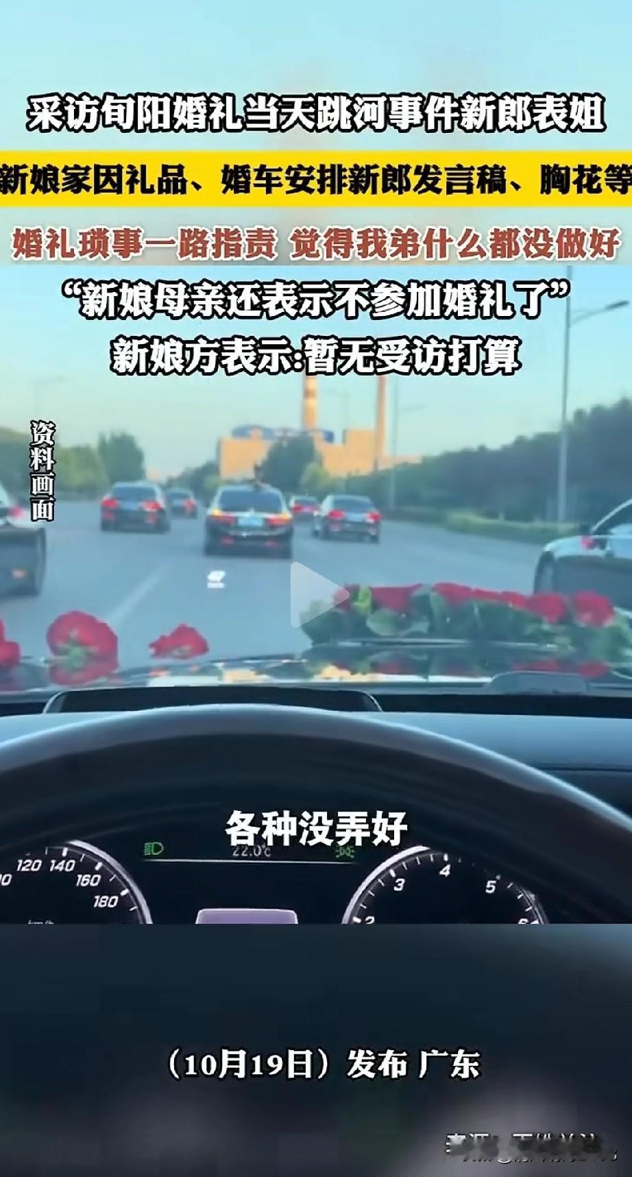 新娘的母亲事儿太多了!据跟婚车的新郎表姐说,接亲的车刚往回走出没多远,新娘她妈就打电话,质问说好的八样礼,为什么是四样礼?又说什么接水为啥是让她接的? 新娘她妈一路上不停的打电话来,又是胸花又是发言稿的,还有杯子的事儿,总之就是各种琐事,不停的打电话来指责新郎没有办好,还威胁说接她的车迟到了,她就不来参加婚礼了! 新郎周某某一路上都没有怎么说话,最后他坐在后座上哭了,说“我这辈子都没受过这么大的委屈” 下车后周某某把手机放在了车身上,然后就跑了!他的表姐没有抓住他,周某某跑到旬河大桥上跳了河! 说实话,谁摊上这样事儿多的丈母娘也够呛!不过如果真的忍受不了,大不了不结这个婚,真的没必要赌气搭上自己的性命,周某某还是太冲动了! (信息来源: 百姓关注)