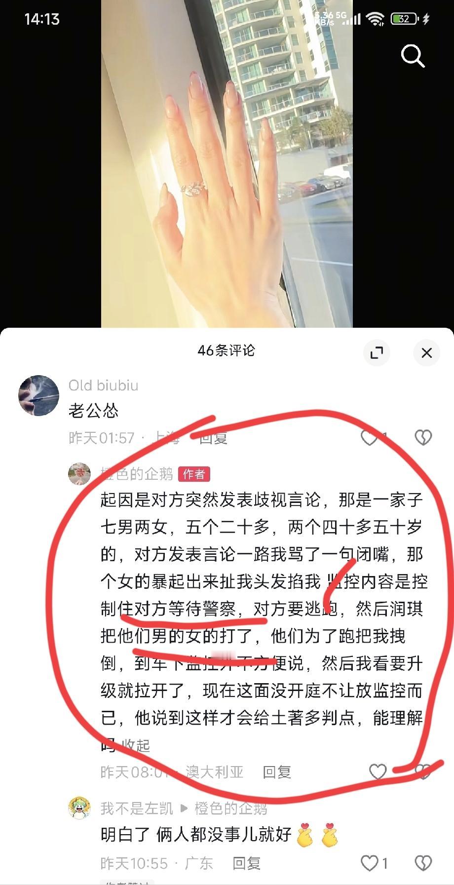 00后中国拳王周润琪在澳洲遇土著人袭击 网友们纷纷看不下去了,觉得他太怂 但是我去查了查,真相可能有反转而且背后恐怕不简单。 随着周润琪遇袭事件的发酵,网上的声音几乎都是一片倒,认为他是一个拳王,仅仅只是舞台上的拳王,没能保护妻子,保护自己。当然也有一些人觉得他乡异国,还是要谨慎行事。 我是去看到了他老婆的短视频作品底下的回复,才知道可能事情经过的一些细节。 在他老婆描述的中,这一切都是有监控的,车上,下车后都有。起因就是他老婆被一个土著人扯头发掐住,周润琪是有控制住对方;重点是他有出手的,打了对方的男的和女的;后来他老婆被拽下车之后,应该也是有动手的,最后才是他老婆拉开了。他老婆还说下车还有监控,不方便公布,要等开庭! 目前来讲所有信息,全靠周润琪的口述去阐述这个事情,所以我觉得这个事情啊,可以得让子弹飞一会,等到那边开完庭之后,等到完整的视频监控公布之后,我们再行判断。 他到底是不是有没有血性,是不是怂夫?