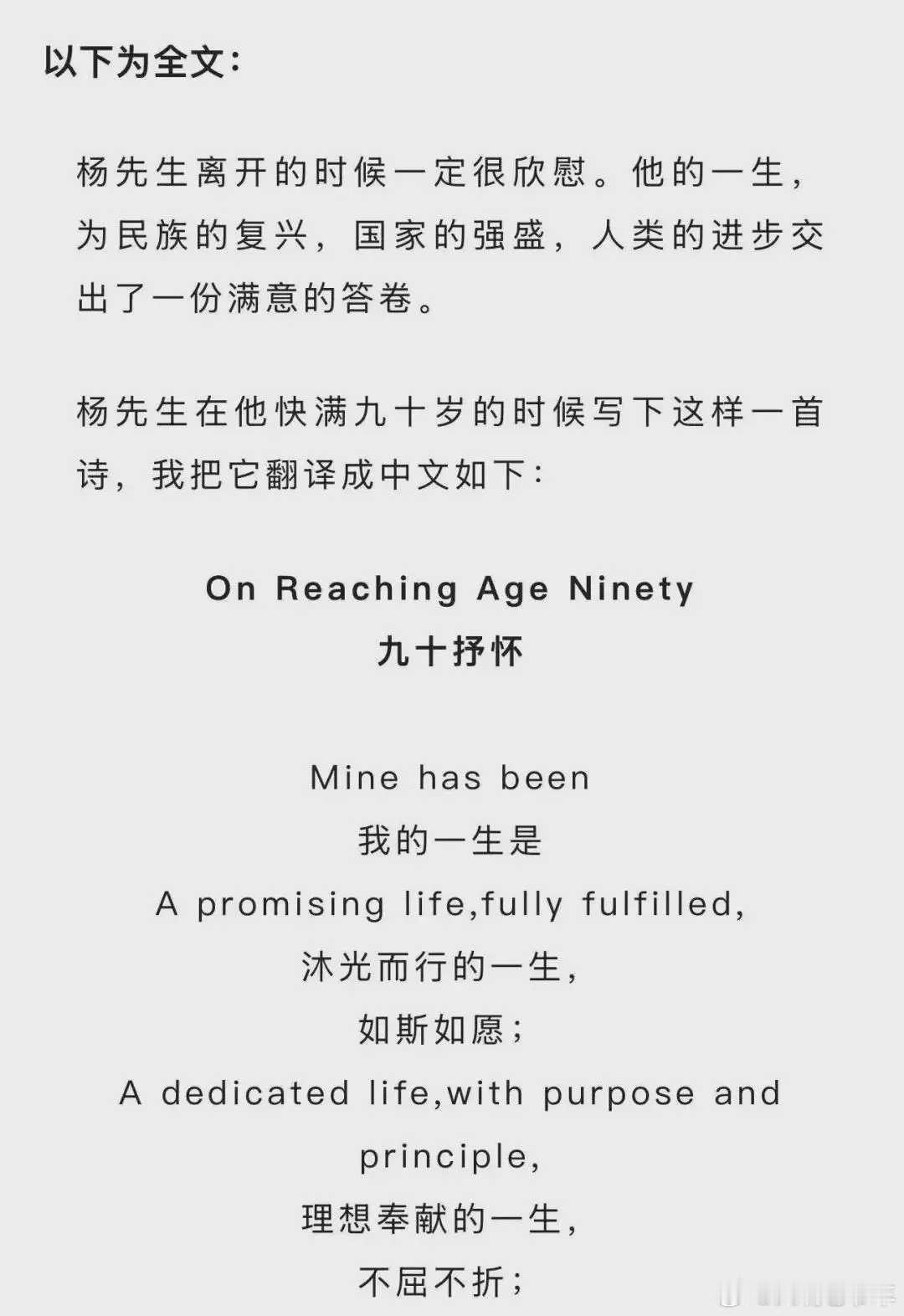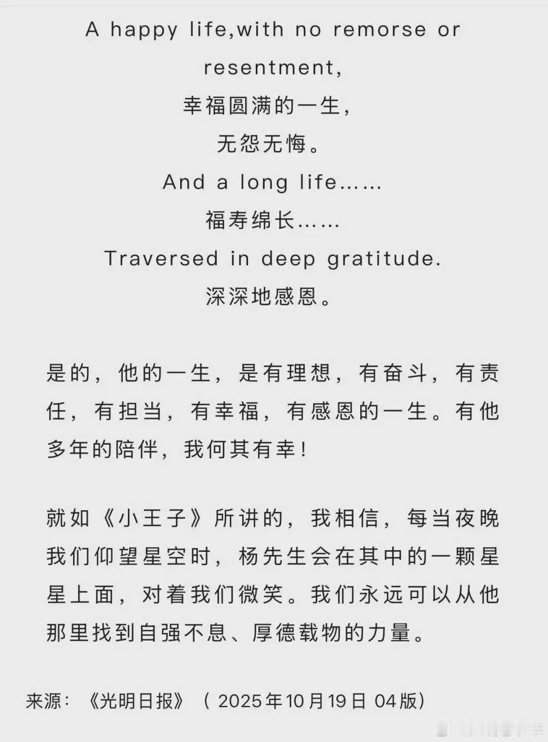 “我相信,每当夜晚我们仰望星空时,杨先生会在其中的一颗星星上面,对着我们微笑。我们永远可以从他那里找到自强不息、厚德载物的力量。”
