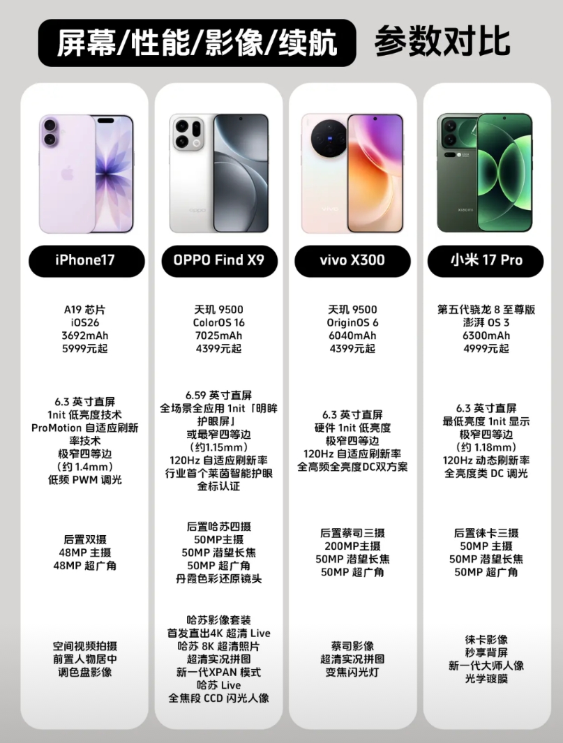 这么一分析,你们知道怎么选了吧,今年iPhone17是不错的,但国产手机整体优势还是更多,特别是OPPO Find X9,哈苏四摄拍照好、电池还更大,整体更全能。
