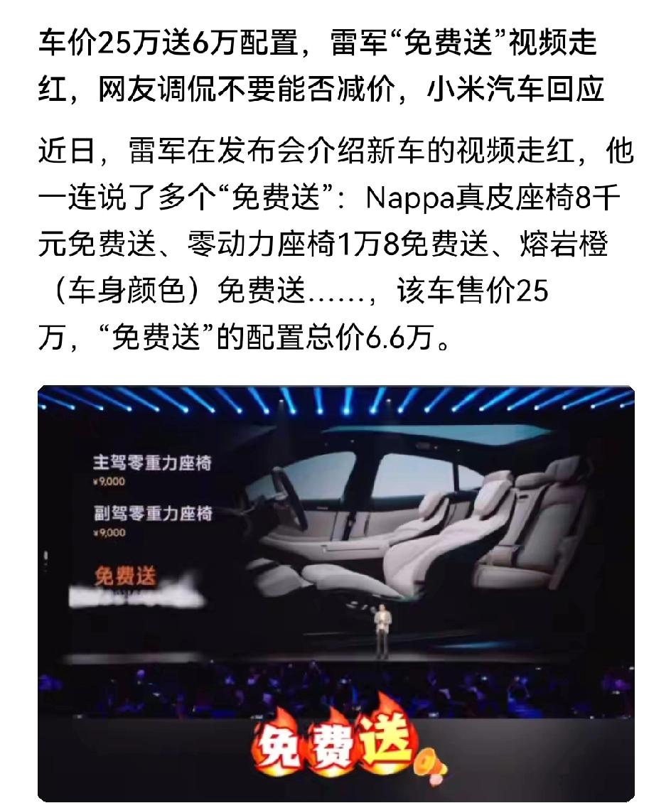 车价25万送6万配置,雷军“免费送”视频走红,网友调侃不要能否减价。 一辆车的正