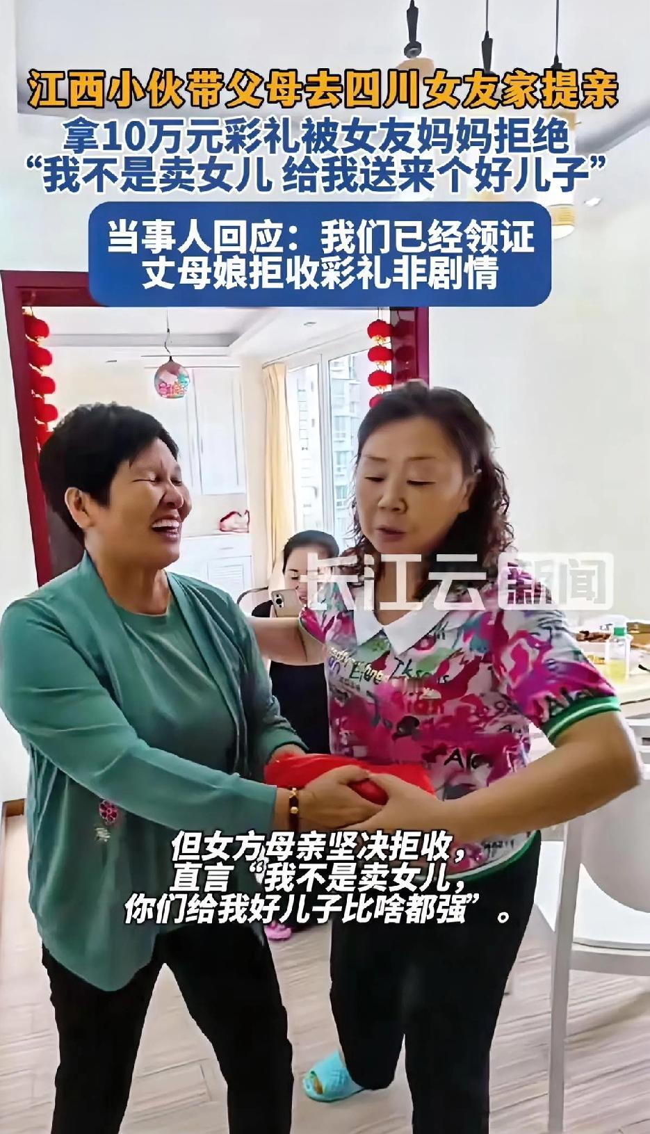 丈母娘嫁女儿,把10万彩礼钱全退回给男方,全网单身青年都在询问丈母娘还有没有女儿! 江西有个退役的小伙梅林,交了个四川女朋友,提亲的时候带父母一起去四川,准备了10万彩礼,有二老攒的也有部分借的! 要知道全国彩礼看江西,江西的老表一出生就背上30w的彩礼!没想到白准备了,女方妈妈直接把钱退回去,跟男方父母说:“你儿子这么优秀,我哪能要这钱”。 男方妈妈出发前还把钱裹得严严实实的,就怕拿不出手,结果进门全程被女方家热情招待,提到彩礼还被拒收! 这种丈母娘不多了,活的通透!她不搞“卖女儿”那一套,只看男方有没有担当,在意的是能不能对她女儿好…… 再想想最近新闻上的,多少人为彩礼掀桌子,闹掰,甚至是付出了生命? 婚姻的本质哪里是比彩礼数字?是看两个人愿不愿意同心,两家愿不愿意互相体谅罢了。 全网都在夸这位丈母娘,本质上是期盼着这样的婚姻:没有彩礼枷锁,只有真心换真心。 没事问一下,你们老家的彩礼一般是给多少?来评论区聊聊!