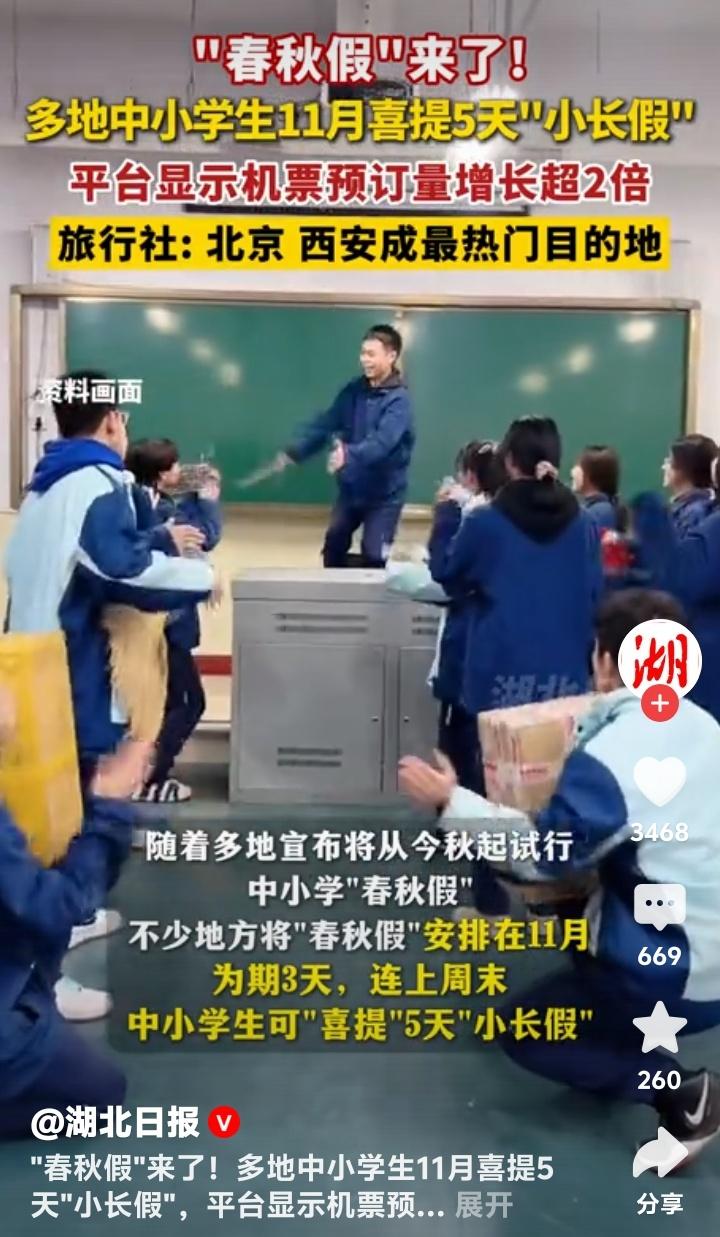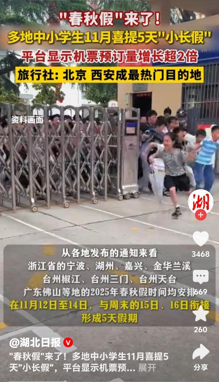 台州家长沸腾了!11月椒江、三门、天台中小学生喜提5天春秋假,机票预订暴增2倍,北京西安古城游爆火 (来源:澎湃新闻、浙江教育厅、去哪儿旅行数据) 秋风送爽的季节,一场专属于学生的“惊喜假期”正悄然改变无数家庭的出行计划。当多数人还在为年假规划发愁时,浙江台州椒江、三门、天台等地的中小学生已率先尝到政策红利——11月12日起的3天春秋假,巧妙衔接周末,凑成5天“黄金小长假”。这不仅是教育制度的创新,更像一块投入平静湖面的石子,激起亲子游市场的层层涟漪。 数据显示,春秋假消息发布后,宁波、佛山等地机票预订量同比暴涨超2倍。北京故宫的朱红城墙、西安兵马俑的千年威严,成为家长咨询的热门关键词。有旅行社坦言:“咨询电话几乎被打爆,原本为常规团预留的机票名额,迅速被亲子家庭抢占。”这股出行热潮背后,是家长对“错峰出行”的迫切渴望,更是对“读万卷书不如行万里路”教育理念的实践。 为何春秋假能引发如此大规模的共鸣?或许是因为它精准戳中了当代家庭的痛点。寒暑假人山人海,节假日价格飞涨,而11月的秋高气爽恰是旅行的黄金窗口期。一位台州椒江的家长坦言:“孩子从课本里读到长城,总念叨着想亲眼看看。现在天气舒适、游客又少,正是圆梦的好时机。”这种“以亲子游促家庭陪伴”的需求,正是政策与人性化考量的双赢。 从更深层次看,春秋假的试行不仅是假期结构的调整,更是对教育本质的回归。当浙江成为全国首个全省推行春秋假的省份,其背后是对“应试教育”与“素质教育”平衡的探索。一位教育学者指出:“短暂的假期不仅能缓解学生的学习压力,更能通过旅行中的实践体验,激发他们对历史、自然的兴趣。”这种“游中学”的模式,或许比课堂上的说教更令人印象深刻。 然而,火爆的背后也藏着家长的纠结。短短5天,是选择文化底蕴深厚的古都,还是风景如画的自然景区?旅行社反馈,北京、西安等目的地因契合中小学课文内容,成为“跟着课本去旅行”的首选。而台州本地的天台山、三门湾等景点,也因“近水楼台”的优势吸引了不少短途游家庭。这种选择困境,恰恰反映了家庭对假期价值的珍视——既不愿浪费难得的亲子时光,又希望每一分钟都物超所值。 面对突然爆发的需求,旅游市场也在快速适应。广之旅等旅行社紧急推出亲子专属线路,行程中融入研学元素,如模拟考古、非遗手作等互动项目。有业内人士分析:“一张儿童票往往能带动1-2张成人票消费,而春秋假带来的‘淡季不淡’效应,将为旅游业注入新活力。”这种市场与政策的良性互动,或许正是消费升级的典型缩影。 对于孩子们而言,春秋假的意义远不止一次旅行。当城市里的学生踏上西安古城墙,当乡村的孩子第一次走进故宫,这些经历可能成为他们成长中难以磨灭的记忆。一位三门县的教师感慨:“教育不应局限于教室,春秋假提供的正是这样一个窗口——让学生看见更广阔的世界,也让家庭关系在旅途中重新升温。” 随着春秋假制度在更多地区推广,其带来的连锁反应或将超越旅游范畴。从机票预订量的增长到亲子产品的创新,从家庭出行方式的改变到教育观念的革新,这场“小长假试验”正在悄然重塑社会对假期价值的认知。而对台州椒江、三门、天台的家长们来说,这个11月,注定是一场关于陪伴、成长与探索的温暖旅程。