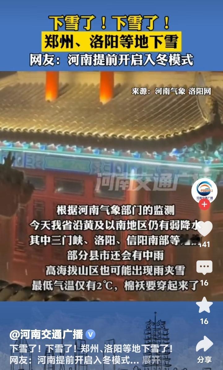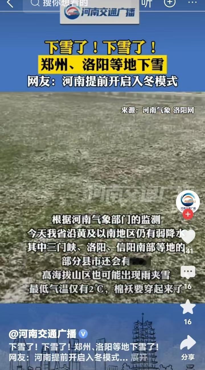 河南老君山初雪震撼刷屏!60年最长阴雨终结,全省一夜入冬背后藏着怎样的坚韧与浪漫?洛阳老君山景区现场直击 (来源:大河报·豫视频、河南气象局等多平台综合整理) 绿叶未黄,白雪已至。10月20日清晨,河南洛阳老君山的峰峦在晨曦中披上银装,这场突如其来的“绿叶雪”瞬间点燃了社交媒体。海拔2000余米的山巅,墨绿松枝与晶莹雪花交织,宛如一幅水墨丹青,游客举起手机的手冻得发红,却难掩兴奋:“昨天还穿着短袖,今天直接入冬!” 这场雪并非偶然。中央气象台数据显示,河南多地气温断崖式下跌8-10℃,郑州最高温仅10℃,创下半年新低。街头行人裹紧羽绒服,电动车挡风被提前“上岗”,网友调侃:“河南人从T恤到棉袄,只隔了一夜北风。”而在这轮降温前,河南刚经历60年来最长阴雨——9月至今平均降水偏多2.9倍,阴雨日数长达36.7天,阳光成了奢侈品。 为何老君山总是率先飘雪?气象专家解释,高海拔山地如同天然“制冷机”,冷空气遇地形抬升,水汽凝华成雪。但今年的初雪背后,更有一层深意:它终结了连绵秋雨,也揭开了河南人“抗冻”背后的坚韧。田间地头,农民抢收玉米的脚步声还未停歇,雪花已落上未播的冬麦田,有人忧心:“庄稼还在地里,冬天就赶着来了。” 社交媒体上,“河南初雪”话题阅读量破亿。网友晒出老君山雪景与城市街景的对比:嵩山少林寺的红墙覆雪,登封古镇的青石板路结薄冰,而郑州地铁里,年轻人搓着手哈气,朋友圈统一文案:“秋裤才是终极归宿。”这种戏谑背后,是河南人对气候突变的集体适应力——从防汛到防寒,他们总能在极端天气中迅速调整生活节奏。 冷空气的余威仍在盘旋。三门峡、信阳等地持续小雨,山区雨夹雪预警未解,但气象部门给出希望:明日全省转晴,阳光将驱散阴霾。然而气温回升缓慢,医生提醒骤冷易引发心脑血管疾病,保暖仍是重中之重。这轮天气突变,仿佛大自然在提醒:人类的坚韧,源于对变化的敬畏与应对。 从历史维度看,河南此次气候异常并非孤例。全球变暖背景下,极端天气频发已成常态,但河南人的应对方式值得深思:田间抢收的农民、雪中执勤的交警、寒夜里检修暖气的工人……每个平凡身影都在诠释“抗冻”的本质——不是忍受寒冷,而是在逆境中守护生活秩序。 老君山的雪终会融化,但这场初雪留下的启示长久回荡:当自然无常成为常态,人类的温暖与协作才是抵御寒冬的真正力量。或许正如一位网友所言:“没有熬不过的雨天,等不来的晴天。”
