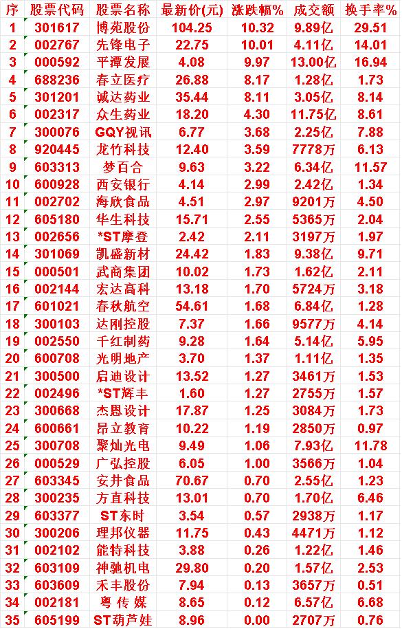 10月20日,MACD日线金叉的35名单汇总 博苑股份:最新价104.25元,