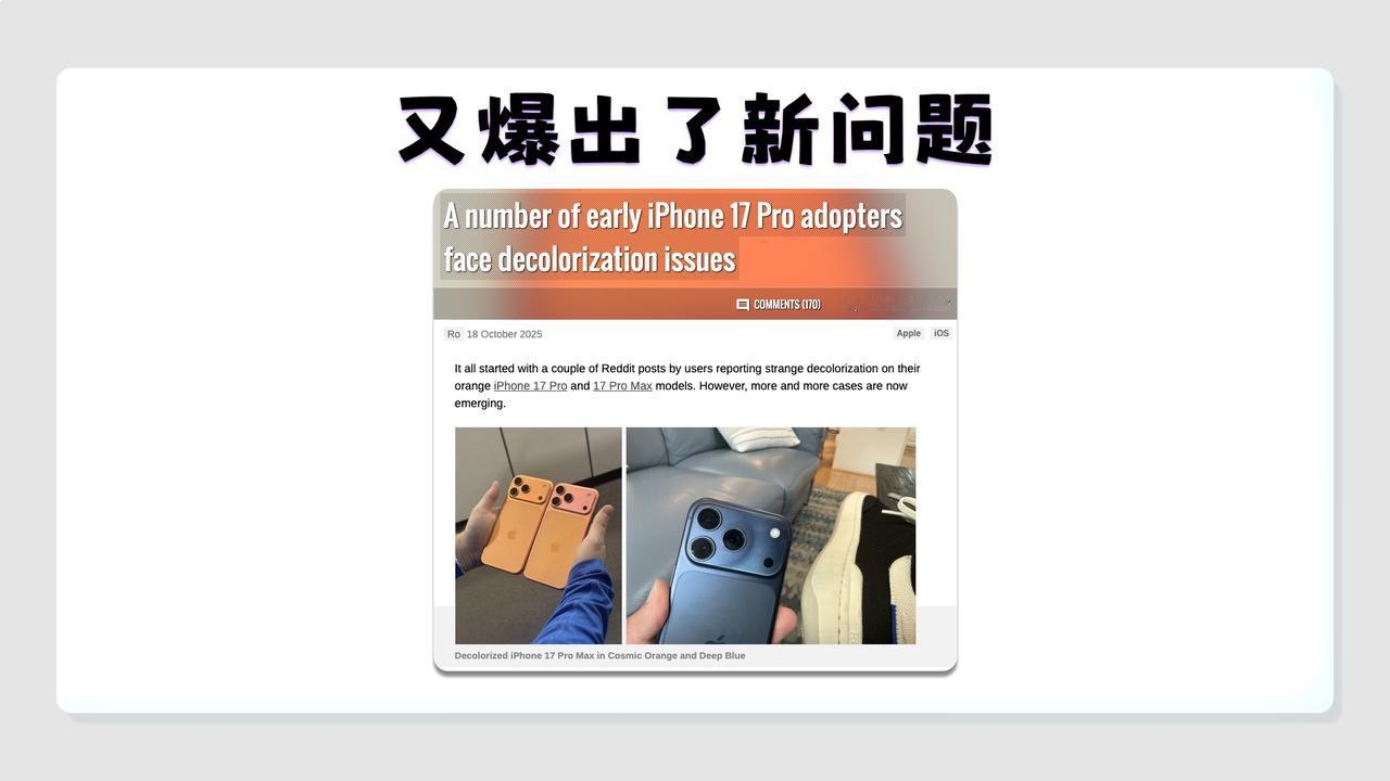 突发,iPhone 17 Pro 曝光“变色门” 根据媒体报道,橙色 iPhone 17 Pro 在阳光下晒一会后。IPhone 后盖的铝合金会褪色变成“粉色”,玻璃背板因材质不同,不会褪色,看起来十分割裂。 iPhone 17 Pro 深蓝色,也出现了因汗液褪色的情况。 看来不止紫外线、热量,汗液也会导致脱色。 这次“变色门”的原因,初步分析是部分批次的iPhone 17 Pro ,后盖阳极氧化涂层没弄好。 导致长期暴露在紫外线、汗液、摩擦、高温下,染色层会被不正常分解。 目前只有银色版本,没有曝光类似的案例,大家双十一下单的时候注意了。