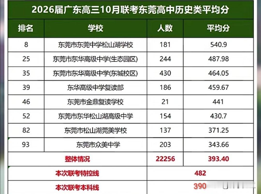 广东省2026届十月高三上进联考各校平均分排名情况。 此次联考全省超120所高中参与,最高分694分,出自佛山石门中学。 东莞市有8所高中参加联考,东莞中学松山湖学校在物理类和历史类的平均分于东莞均位列第一,其中物理类在全省排名第15位,历史类全省排第8位。