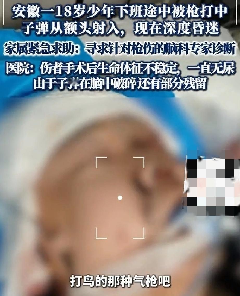 10月20日,安徽亳州利辛县。凌晨一点,18岁的少年下班,在回家的路上,突然被一颗汽枪子弹击中头部。 少年被送到县医院抢救,从额头取出大部分碎片。由于子弹的威力大,弹头破碎,仍有部分碎片残留在脑部,取不出来。 医院接受采访时表示,患者状态表现很不好,处于深度昏迷中。两点钟手术后,生命体征不平稳。 县医院条件有限,没办法对孩子做出进一步抢救。家属看到孩子昏迷不醒,枪伤随时都有可能夺去孩子的生命,不禁焦急万分,紧急求助针对枪伤的专家来诊断。 据悉,当地存在着用枪打鸟的现象。不知是谁,误伤了少年。看来,真得严格管控好枪支,避免类似伤人事件发生。