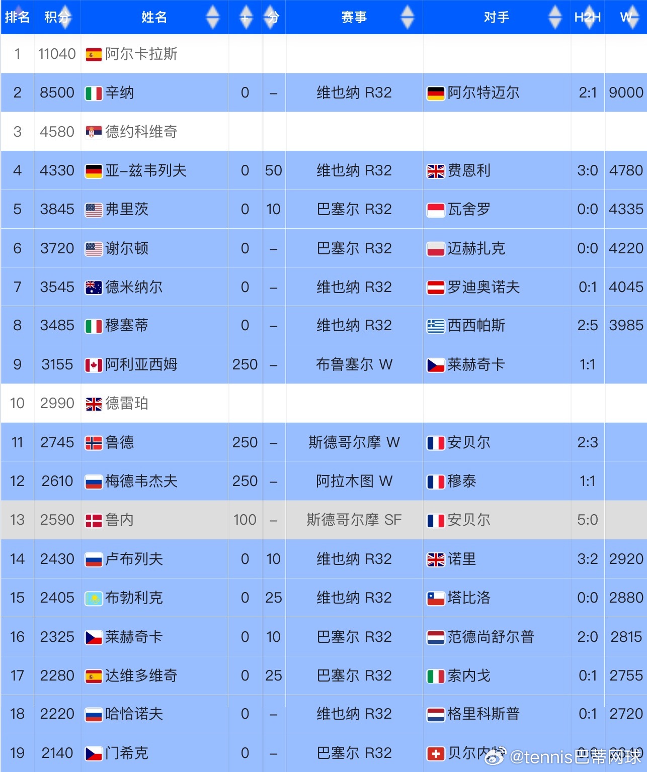 看看👀atp的冠军积分榜,双子星和德约科维奇确定入围;而上周刚刚在250赛事夺冠🏆的梅总,阿利雅西姆和鲁德也加入了年终席位的争夺;