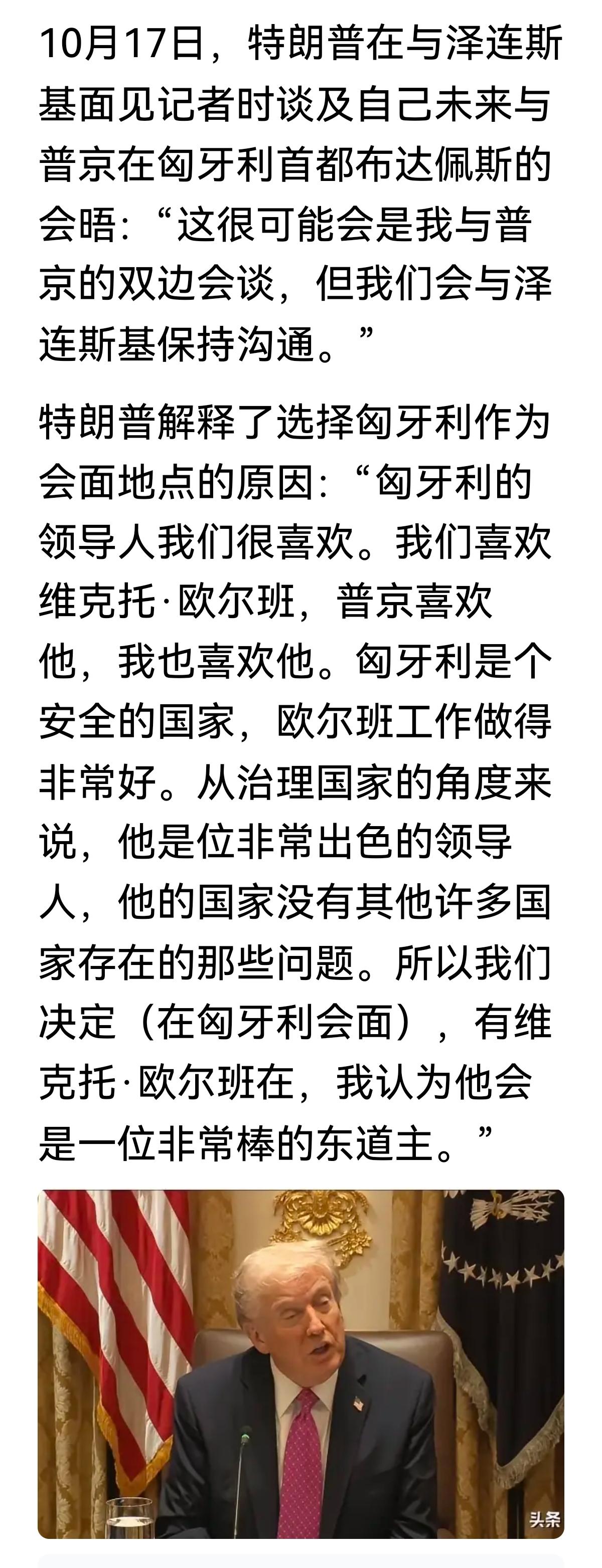 着急!着急!还是着急! 老特敦促司机,要么接受普京的条件,要么被大毛打残。 这是《金融时报》的大标题。 这是他准备与普京在匈牙利布达佩斯再度会面之前在白宫对司机提出的建议。 老特急于与普京会面,达成俄乌停火协议,这不仅仅是上次俩人在阿拉斯加会晤的延续,还应该是老特新策略的一个开始。 大家思考几个问题,就能明白他的用意了: 1.这次是他主动打电话跟普京聊了两个小时。被人拿捏了,着急啊! 2.他跟乌国的矿产资源合作协议早就签完了,俄乌不停战,老特不敢在乌国开矿。 3.老特之前打算向乌国提供战斧导弹的威胁言论,也只是约普京通电话见个面的而已。