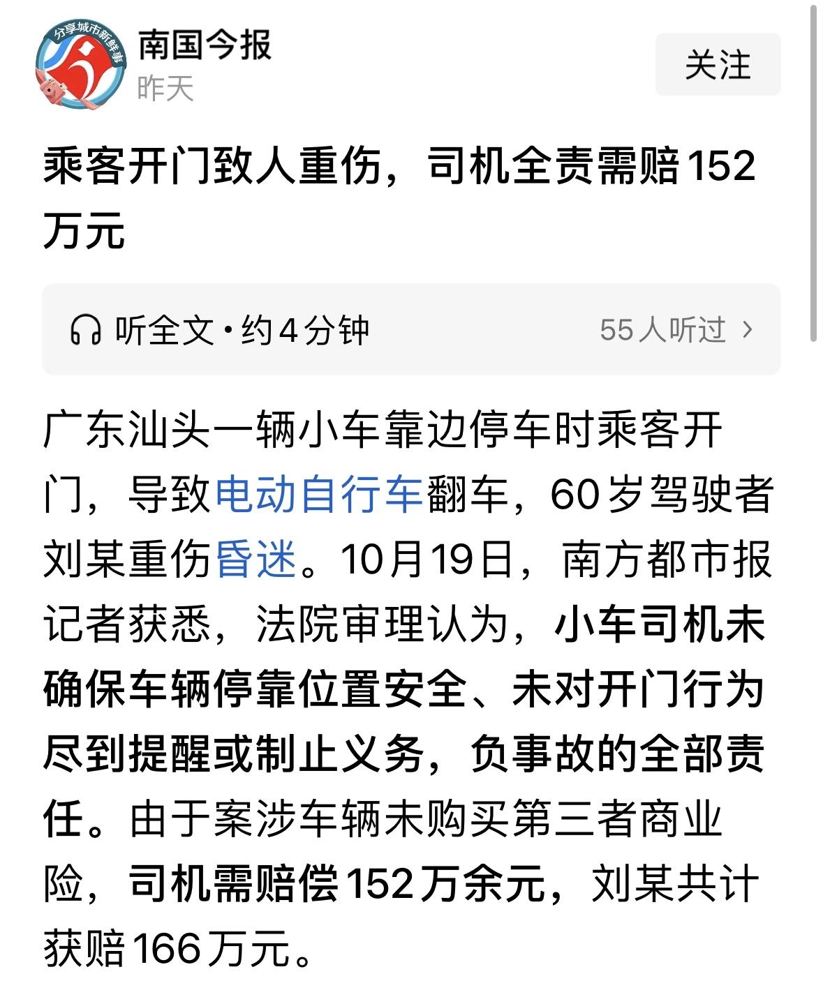 “冤不冤?”广东汕头,一司机到目的地后把车停在路边,车身和路边留了1米的空隙,这时,一大爷骑着电动车从空隙中穿过,正好赶上乘客开门下车,大爷遭遇“开门杀”后,连人带车摔成颅脑重伤,在医院一躺就是2年,生活也没法自理了,事后,法院认为司机没有把车停在安全的位置,也没提醒乘客下车时注意后方来车,所以司机负全责,并赔偿大爷家属152万。 2023年6月的一天,网约车司机徐某敏像往常一样拉活。 载着乘客行驶到某路段时,徐某敏见路边有块空地,便把车往路沿石旁停了停,车身和路边还留着差不多一米的空当。 就在徐某敏停车这会儿,60岁的刘某骑着电动车从后面过来。 老刘平时走这条路接孙子放学,对路况熟得很。他瞅着前面轿车和路边有空隙,就打算从这缝隙里穿过去。 谁承想,刚骑到车旁边,副驾驶车门突然“哐当”一声被乘客推开了,正好撞在老刘的电动车把手上。 老刘连人带车摔了个结实,后脑勺重重磕在地上,当场就不省人事。 送医后,医生诊断老刘是重度颅脑损伤,直接进了重症监护室。 更让家属揪心的是,老刘这一昏迷就是两年多,期间转了2家医院,前后住院232天。 后来经专业鉴定,老刘的伤情达到一级伤残和八级伤残各一处,相当于除了躺着啥都干不了,吃喝拉撒全得靠人伺候。 老刘的家属急得团团转,先找了交警队。 交警认定徐某敏全责,理由是停车位置不当,且没有提醒乘客开车门注意安全。 徐某敏心里不服,觉得乘客自己开车门也该担责,于是申请了复核,然而,市交警复核后还是维持了原判,那就是徐某敏得负全责。 到了法院打官司时,徐某敏更觉得委屈。自己只是正常停个车让乘客下车,哪能料到会出这档子事? 那么,从法律角度来看,徐某敏应该对这件事负全责吗? 《道路交通安全法实施条例》第63条第4项规定:机动车在道路上临时停车,应当遵守下列规定:车辆停稳前不得开车门和上下人员,开关车门不得妨碍其他车辆和行人通行。 徐某敏将车辆停靠路边时,车身与路边留出1米空隙,这个操作虽然符合日常停车习惯,但没有严格履行“确保安全距离”的法定义务。 根据规定,临时停车需以“不妨碍其他车辆和行人通行”为前提。徐某敏没有评估该1米空隙是否足以让非机动车安全通过,也没有预判乘客开门可能引发的风险,客观上为后续碰撞创造了条件。 徐某敏作为驾驶人,在乘客下车时没有主动提示“观察后方来车”或“采用荷式开门法”也就是用离车门远的手开车门,强制转身观察后方,这也导致乘客在没有注意的情况下突然开门。 这种“未尽提醒义务”的行为,被法院认定为“为事故发生创造条件”的关键过错。 法院审理后认为,徐某敏临时停车没选安全位置,又没提醒乘客开车门看后面,这“一停一开”直接给事故埋了雷,必须担全责。 也就是说,法院认定徐某敏负全责的核心逻辑在于:他违规停车行为与未履行提醒义务的行为共同构成了事故发生的直接原因。 即便乘客实际执行了开门动作,但驾驶人作为车辆控制者和安全责任主体,需对“停车状态下的车辆周围安全”承担整体责任。 这种责任分配也符合《民法典》第1165条“过错责任”原则,徐某敏的过失行为与刘某的损害结果存在直接因果关系。 更麻烦的是,徐某敏的车只买了交强险,没买商业三者险。法院判决交强险公司赔14万3千多,剩下的152万多全得徐某敏自己掏腰包,也就是说老刘可以获得166万的赔偿。 这判决一下来,徐某敏傻眼了。他开网约车本来就挣辛苦钱,哪能一下拿出这么多钱? 老刘家属那边也急得很,老刘在床上躺了两年,每天光护理费、药费就得上千块,这152万听着多,可摊到每天也才将够维持治疗。 后来,徐某敏天天跑医院求家属宽限,可老刘家属说啥也不肯让步。他们觉得老人遭这么大罪,司机就该负全责。两边就这么僵着,谁心里都不好受。 这下徐某敏的日子彻底不好过了,家里孩子正上学,现在全家省吃俭用攒钱赔钱,日子过得紧巴巴。 有人说呀,这个判决不太对,按照我们上海的情况。开门杀如果没有造成严重的后果。一般驾驶员负全部责任。开门杀如果后果严重,就像本次事件一样,乘车的乘客也要承担一部分的责任。 上海的法院有过这样的判例,开门杀造成电瓶车驾驶员死亡。判小车驾驶员负主责,乘客负次要责任,电瓶车司机没有责任。 司机,乘客,还有电动车都有责任,乘客开门造成直接后果,应该负此次事故的主要责任,司机没有尽义务提醒乘客开门注意后方行人车辆,负次责,电动车走机动车道,并且在前方道路有机动车的情况下强行加塞挤缝隙,负次要责任,按比例6:2:2。 这老刘也是,车与路边一米的距离,还要骑着电动车硬往里开,只能说司机倒大霉了! 对此,你怎么看?