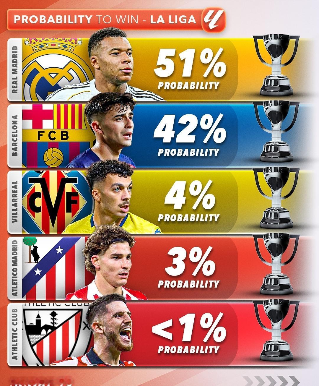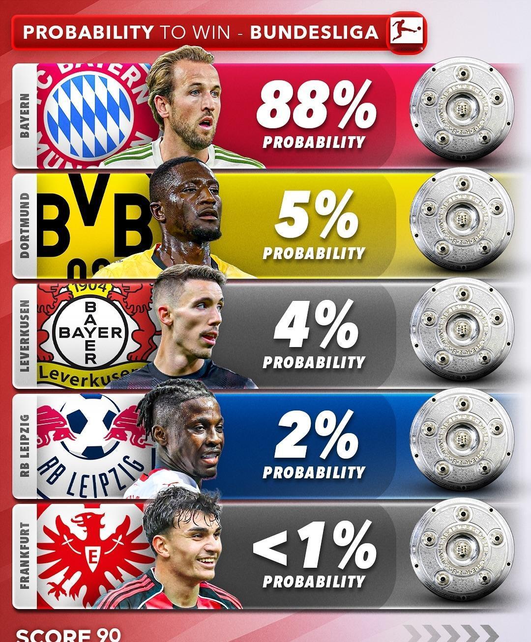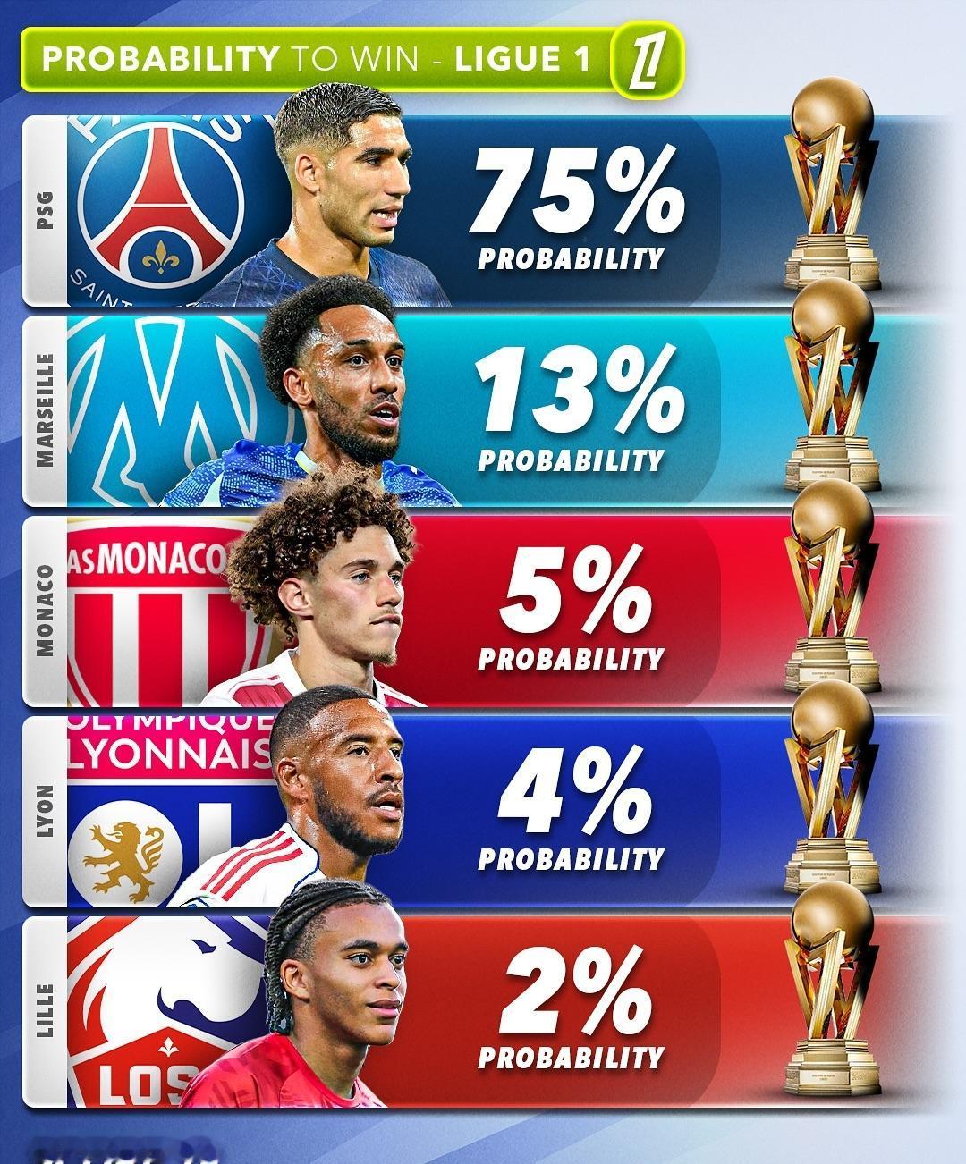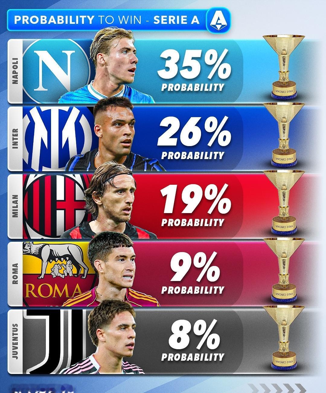 五大联赛冠军归属! 外媒给出了五大联赛各俱乐部的夺冠概率,看看他们都看好哪些球队? ★英超:连续三个亚军可以换一次冠军? 阿森纳看来这次真的要拿冠军了,利物浦问题太多,反而是改了控球踢法的曼城还能对枪手有所威胁。 ★西甲:皇马和巴萨积分咬的很紧,皇马的情况比巴萨稍好一点,但也有限。 ★意甲:现在米兰排名第一,单线作战确实有优势,虽然伤员不少,但争冠球队都差不多,长期来看,在阿莱格里的老到经验下,争冠有戏,最大的竞争对手还是国米,那不勒斯感觉没戏。 ★德甲:拜仁的夺冠概率仅有88%,按照他们现在的连胜势头,这个概率给的太保守了,应该直接标100%! ★法甲:虽然巴黎刚刚丢掉了榜首位置,但等那几位主力伤愈复出,联赛冠军应该没问题。
