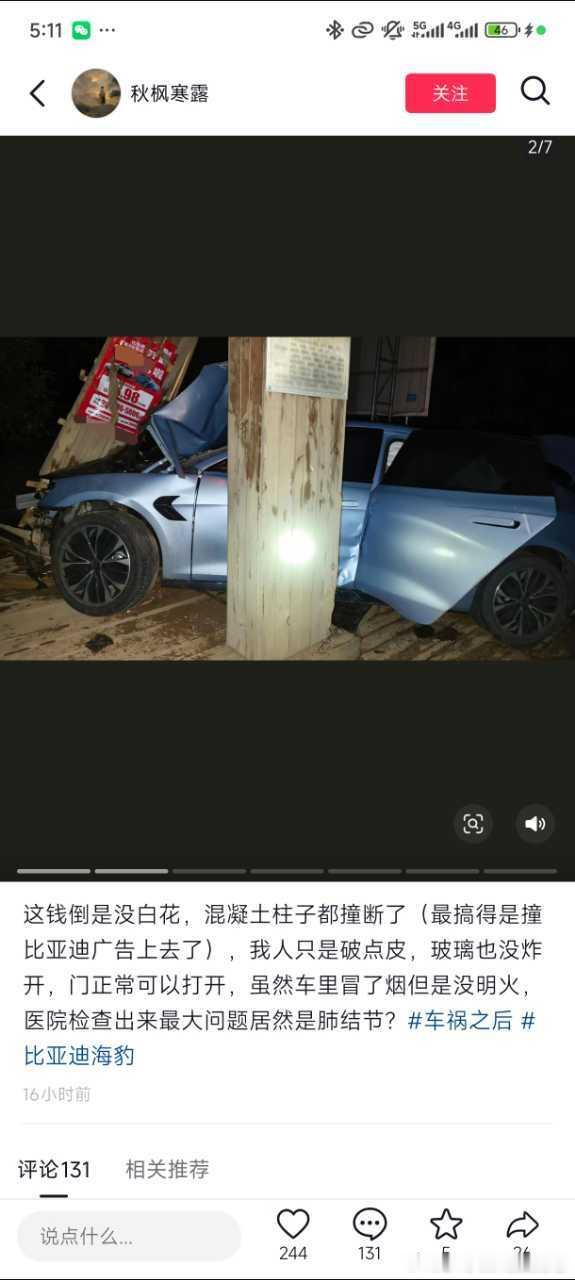 CTB架构的安全性没得说,比亚迪海豹EV一场事故,把混凝土柱子撞断了,车门正常打