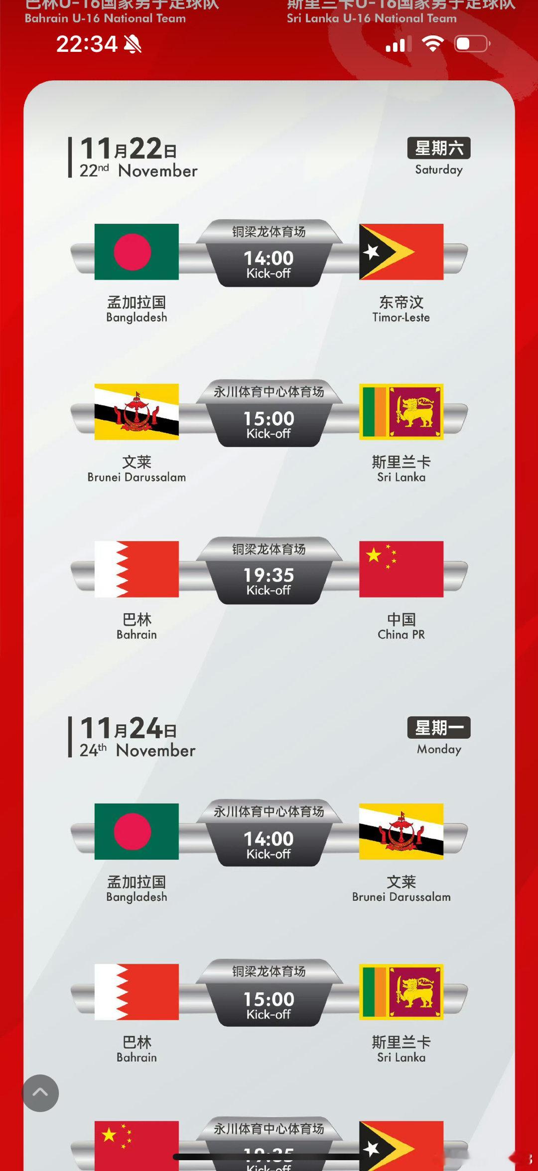 11月26日:中国 vs 文莱(铜梁龙体育场)