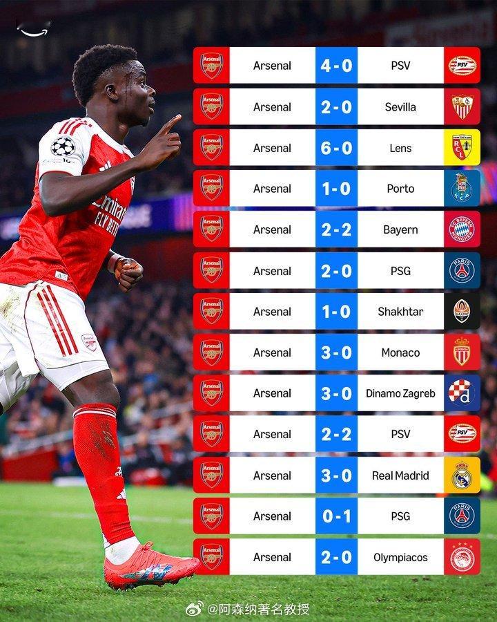 阿森纳自2023年重返欧冠以来的主场战绩:13场比赛,10胜2平1负,进31球,失5球,10场零封对手 阿森纳vs马竞 阿森纳著名教授