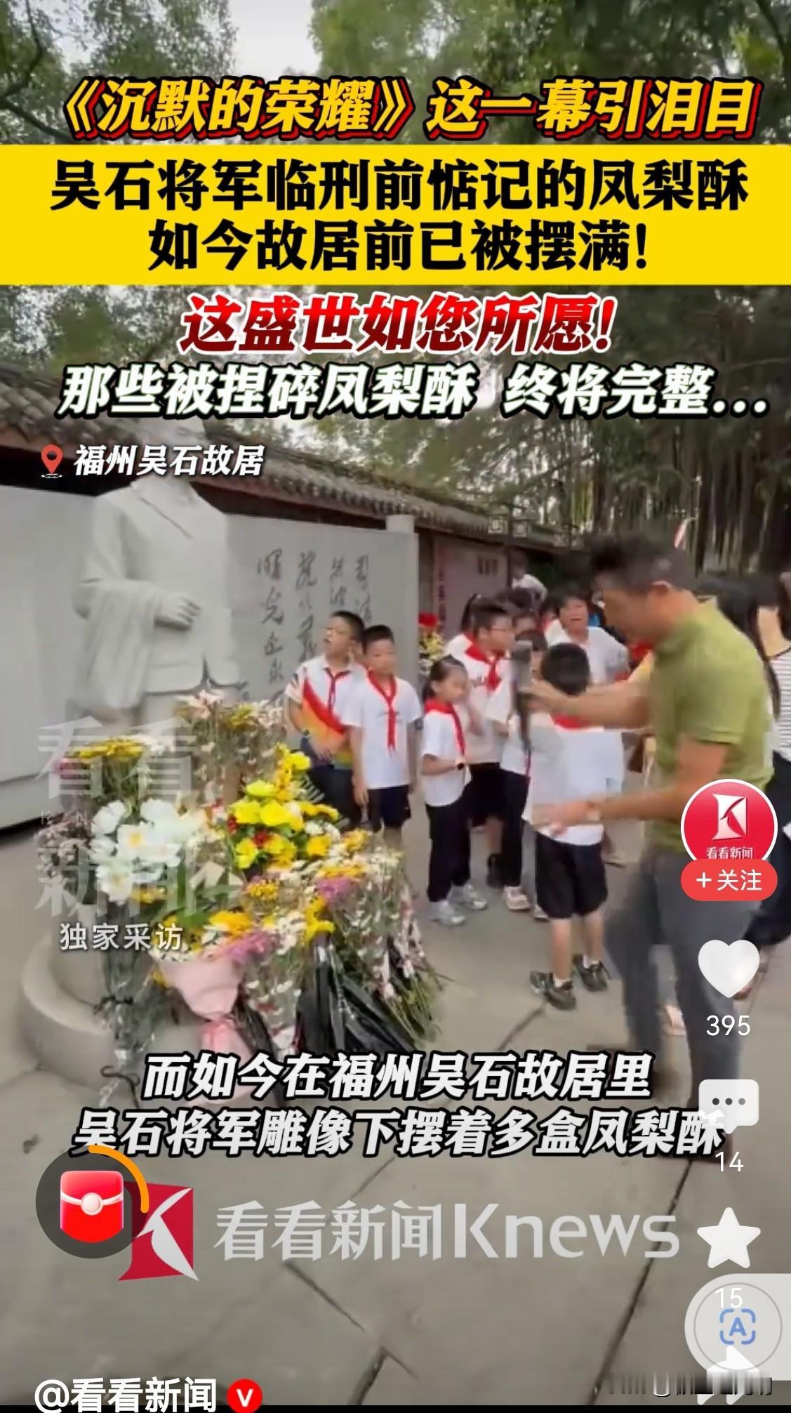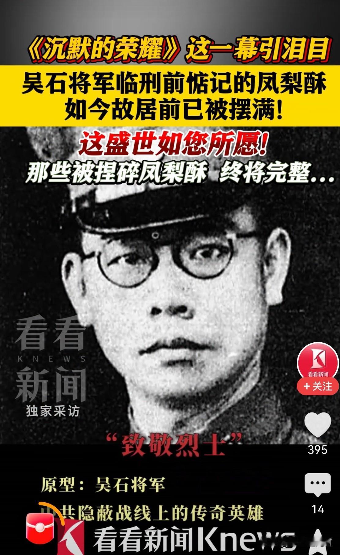 凤酥梨 最近,吴石将军故居除了堆满了鲜花外,还有多盒完整的凤梨酥。 用心的观众都记得这一幕:临刑前,国民党当局允许家属去探视。 夫人王碧奎提着一盒自己做的凤梨酥来看望吴石将军,夫妻两个隔着铁窗,手紧紧握在一起。 为了不让夫人太难过,吴石故做轻松地说:“看看你都给我带了什么好吃的?” 王碧奎打开盒子一看,每个凤梨酥都被特务捏碎了,是检查时为了防止夹带什么入狱。王碧奎看到为丈夫精心制作的糕点被糟蹋成这样,不由得泪如雨下。 她哭着让吴石打电话给唐总长,让唐和特务们说,下次至少要留一个完整的凤梨酥给吴石。吴石听了,心如刀绞,他缓缓地一字一顿地说:“可能没有下次了。” 许多观众看到此处,不由得泪目,这就是所谓的生离死别啊,而英难临刑之前,竟然连一只完整的凤梨酥也没有吃上。 有人记着他的惦念和喜好,去他的故居纪念他,特意为他带了满盒的完整的凤梨酥,以弥补先烈的遗憾! 希望台湾能够早日回归,这是对先烈们最好的告慰!