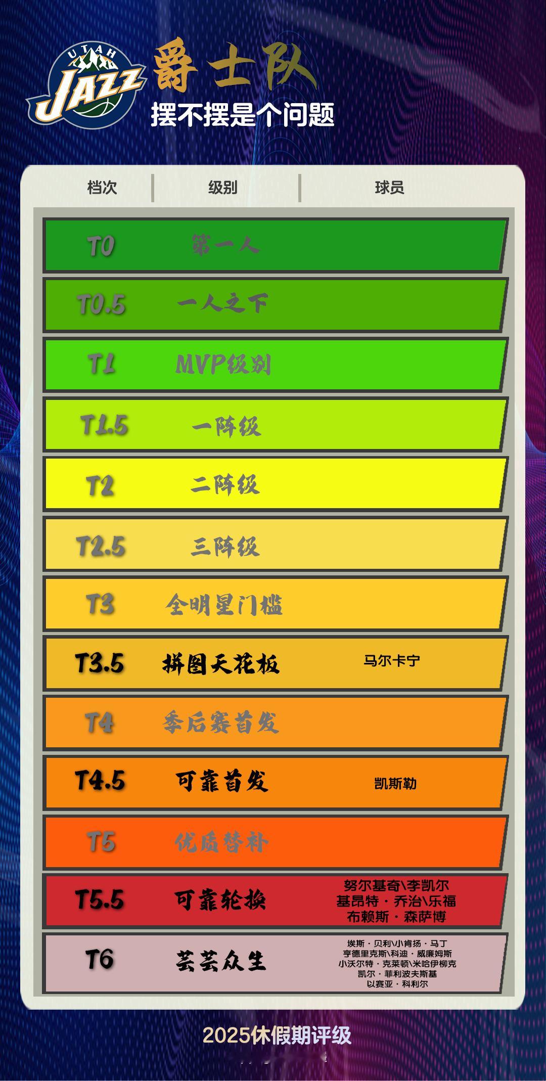 这是4支球队中相对有点谱的。这么讲并不代表爵士的建队进度多顺利,更多是基于对他们队史的尊重。爵士有不靠高顺位选秀孕育出建队核心的案例,还不止一次,这似乎是爵士摆得不够烂的底气。