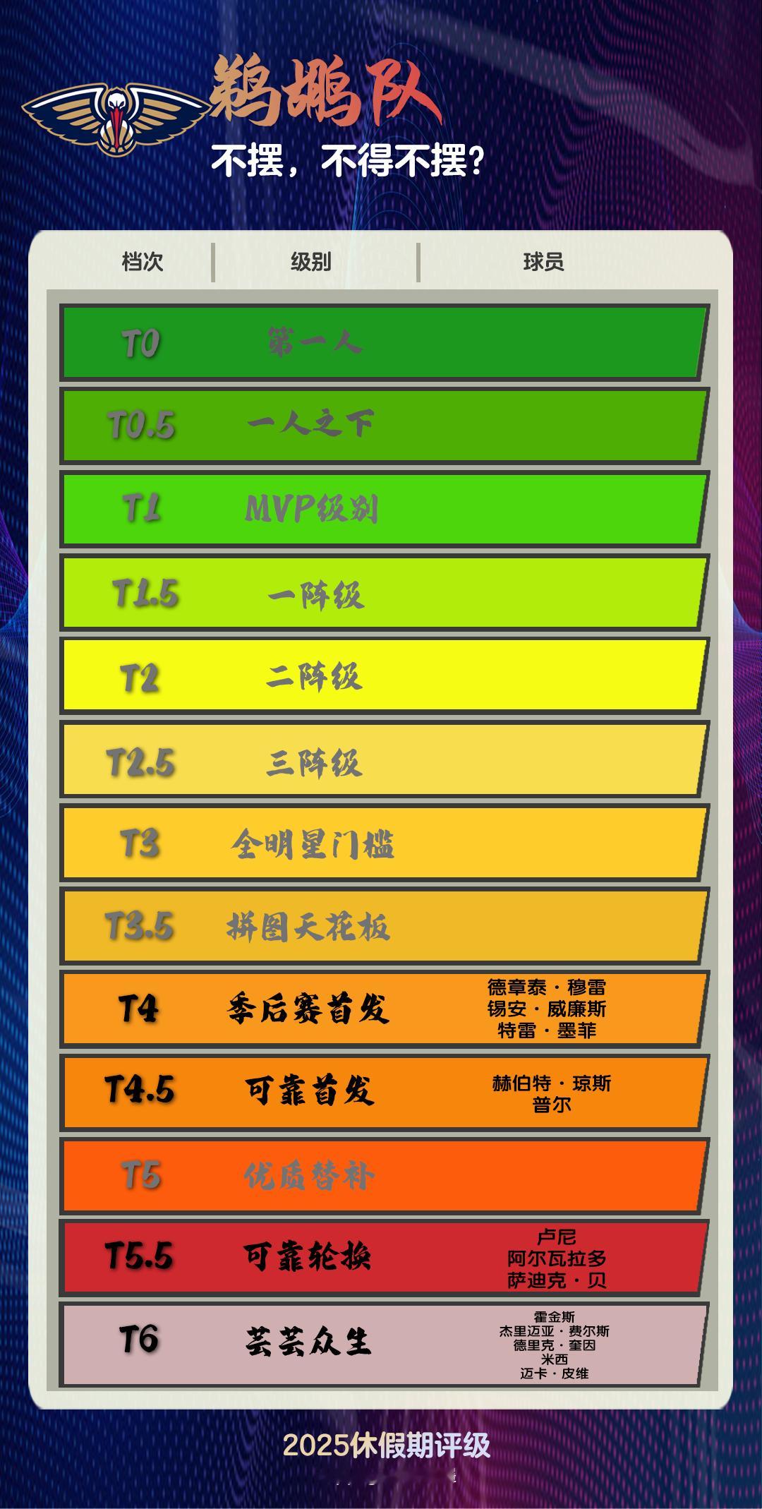 哎,不知道怎么评价鹈鹕。普尔说,他跟胖虎磨合后将非常恐怖,我只知道上一次恐怖的主角是他和怀斯曼。胖虎能上演浪子回头金不换的剧情吗?他跟普尔这对胖虎&大雄组合,想一想有那么一点进攻契合度。但哥俩就像初中班级里最羡慕外面黄毛又当不了黄毛的假混混,想上道大哥都嫌他们不靠谱。德章泰·穆雷倒是黄毛气质拉满,能跟大哥搭上两句话,奈何他伤愈复出还有时日,而他那个伤大家都懂,恢复成什么样还得看。