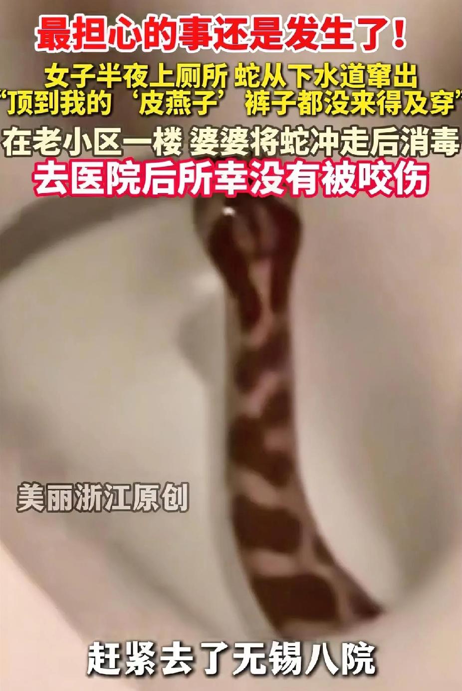 吓坏了!”江苏周女士上厕所时突然感觉被“顶”了一下,回头一看吓得裤子都没来得及穿,原来马桶里竟冒出一条蛇! 江 江苏周女士的经历堪称“现实版恐怖片”——深夜上厕所时,私密部位突然被马桶里钻出的蛇“顶了一下”,吓得她裤子都没穿就跑,幸好婆婆及时冲蛇、送医检查,才确认未被咬伤。 细究原因,周女士住的老小区管道老旧,还连通外部沟渠,给蛇虫提供了可乘之机。抖音高赞视频早就提醒:低楼层(1-3楼)是高危区,蛇能通过马桶S弯管“游泳”入户,尤其夏季潮湿时风险更高。 别觉得这事离你远!网友实测的防护法超实用:给马桶或下水道装止逆阀/防护网,既能防蛇虫,还能避免钥匙、打火机掉管道。记住,老小区管道维修、化粪池加盖也不能少,毕竟安全无小事,提前预防总比遇事惊魂好! 马桶惊现蛇 老小区安全隐患