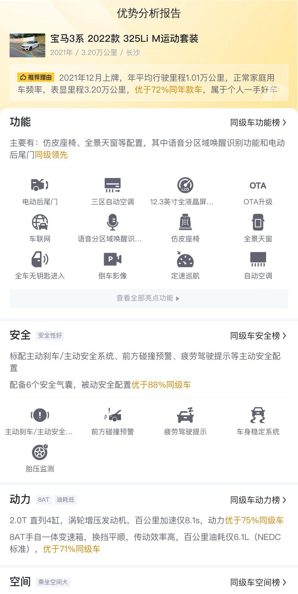 除了以上这些,我们还需要考虑一些其他的因素,比如配置、油耗、后期维护成本等等。这辆325Li M运动套装配备了仿皮座椅、全景天窗、语音分区域唤醒识别、电动后尾门等一系列实用配置,提升了驾乘体验。百公里油耗6.1升(NEDC标准),也比较经济。