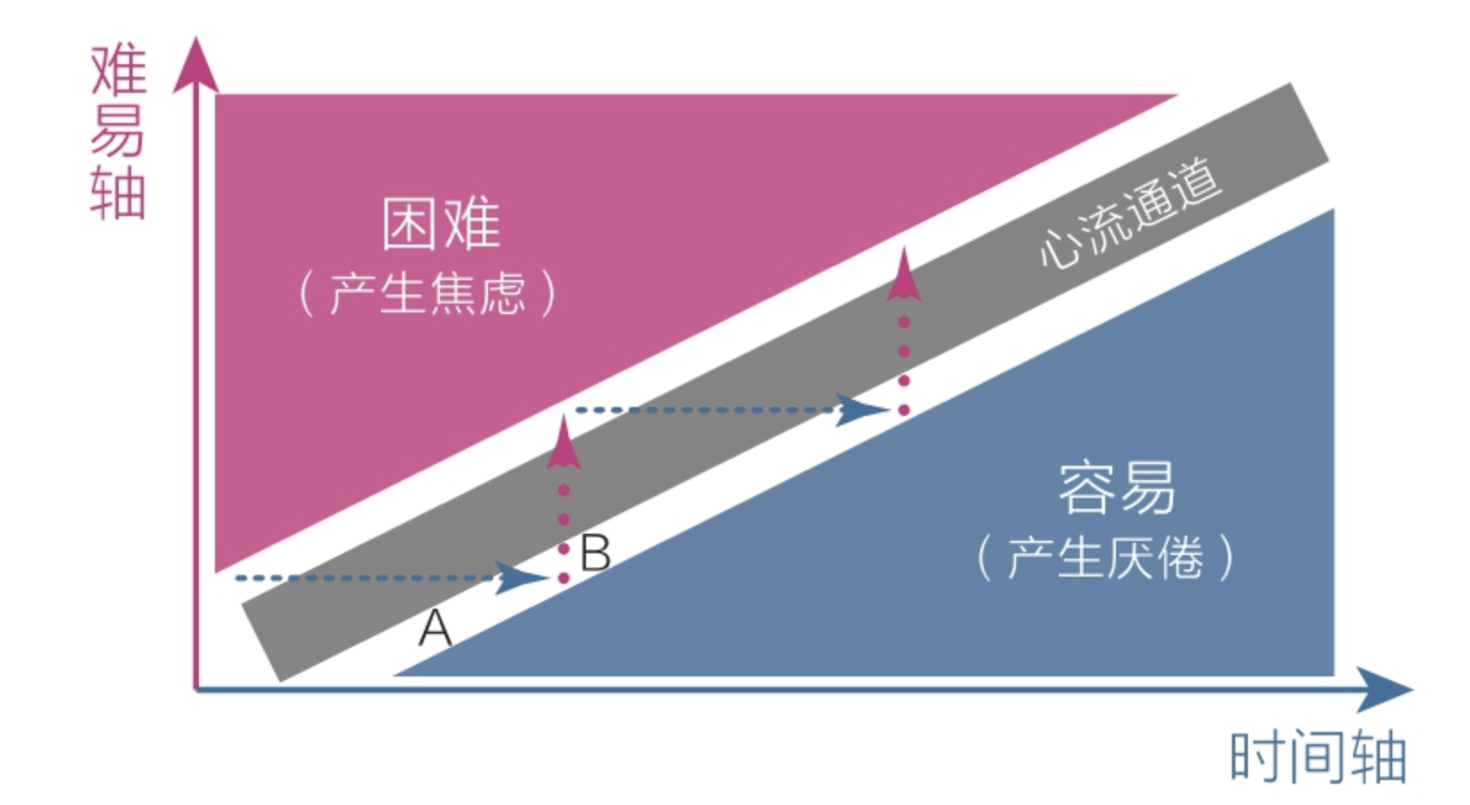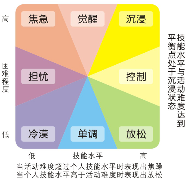 第四、在拉伸区学习。著名心理学家米哈里·契克森米哈赖在《心流》一书中提出这样一个模型:当人们对当前的活动感到厌倦时,说明应该提高难度;当人们对当前的活动感到焦虑时,说明应该保持这个水平专注练习,如此反复交替就可以让自己进入心流通道,沉浸其中。想一想那些拖延的人,他们学习的时间也不少,但总是在启动的状态,每次都是在自己的舒适区里徘徊,很难进入自己的拉伸区。