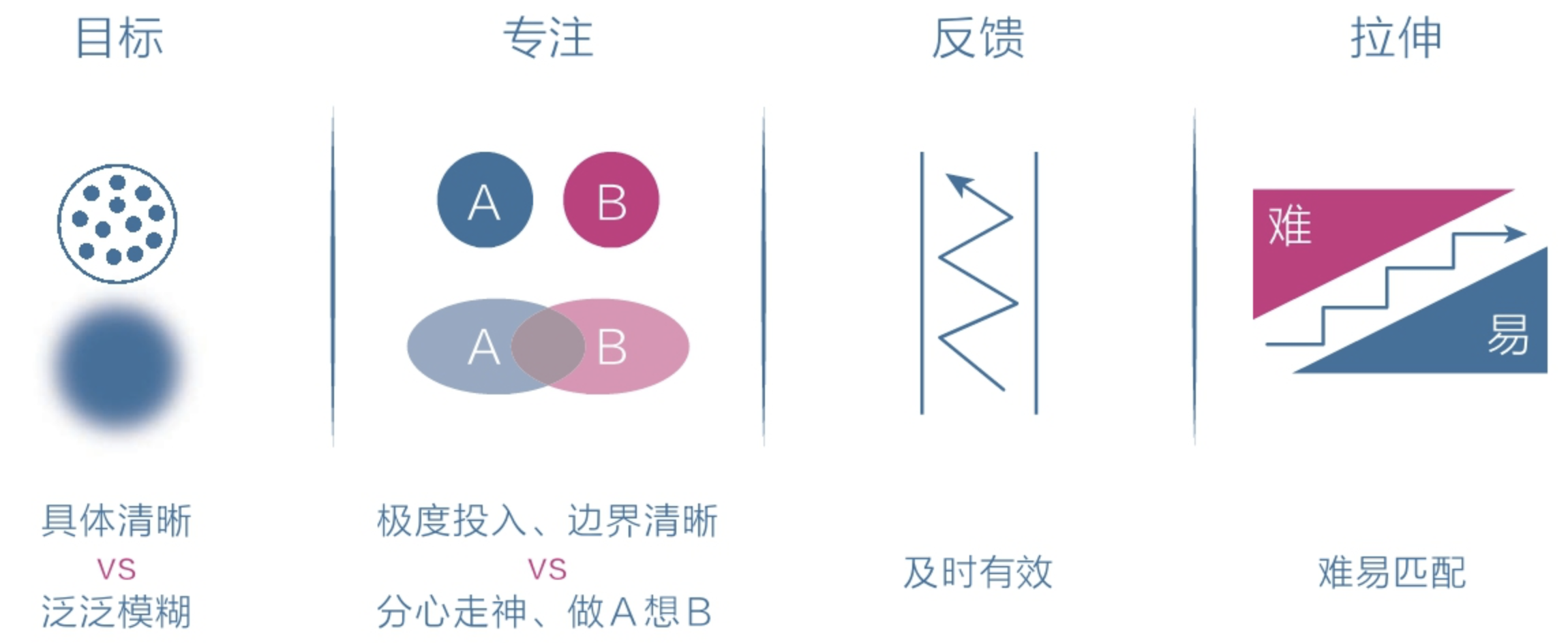 第二、终极专注。我们宁愿选择短时间内的100%专注,也不要长时间的70%专注。行动就好比我们的的“躯体”,感受更像“灵魂”。专注的时候,我们的行动和感受融为一体,不容易分心,容易形成正向反馈,也就是人们常说的身心合一。