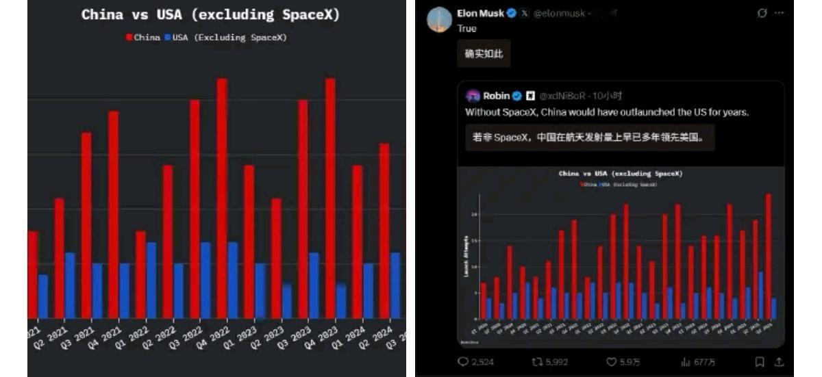 马斯克转发了一个有意思的图表:“若非 SpaceX,中国在航天发射量上早已多年领先美国。”