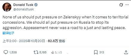 波兰总理图斯克不点名批评特朗普,称在领土让步的问题上,西方不应该向乌克兰施压,而应该向俄罗斯施压。