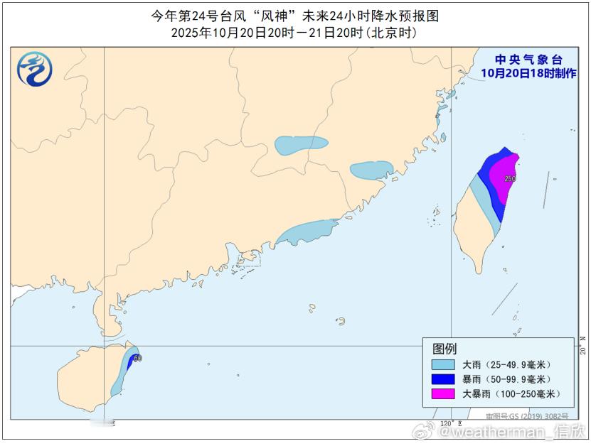 降水预报:20日20时至21日20时,福建东北部和南部、江西南部、广东东南部沿海、海南岛东部、台湾岛中北部有大到暴雨,台湾岛北部局地有大暴雨(100-250毫米)。